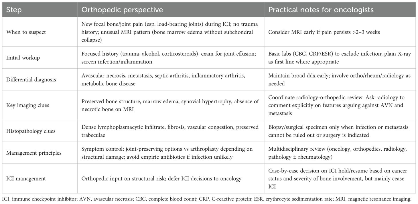 Table 2. Key clinical features and management considerations for suspected immune-mediated osteitis during immune checkpoint inhibitor therapy (orthopedic perspective).