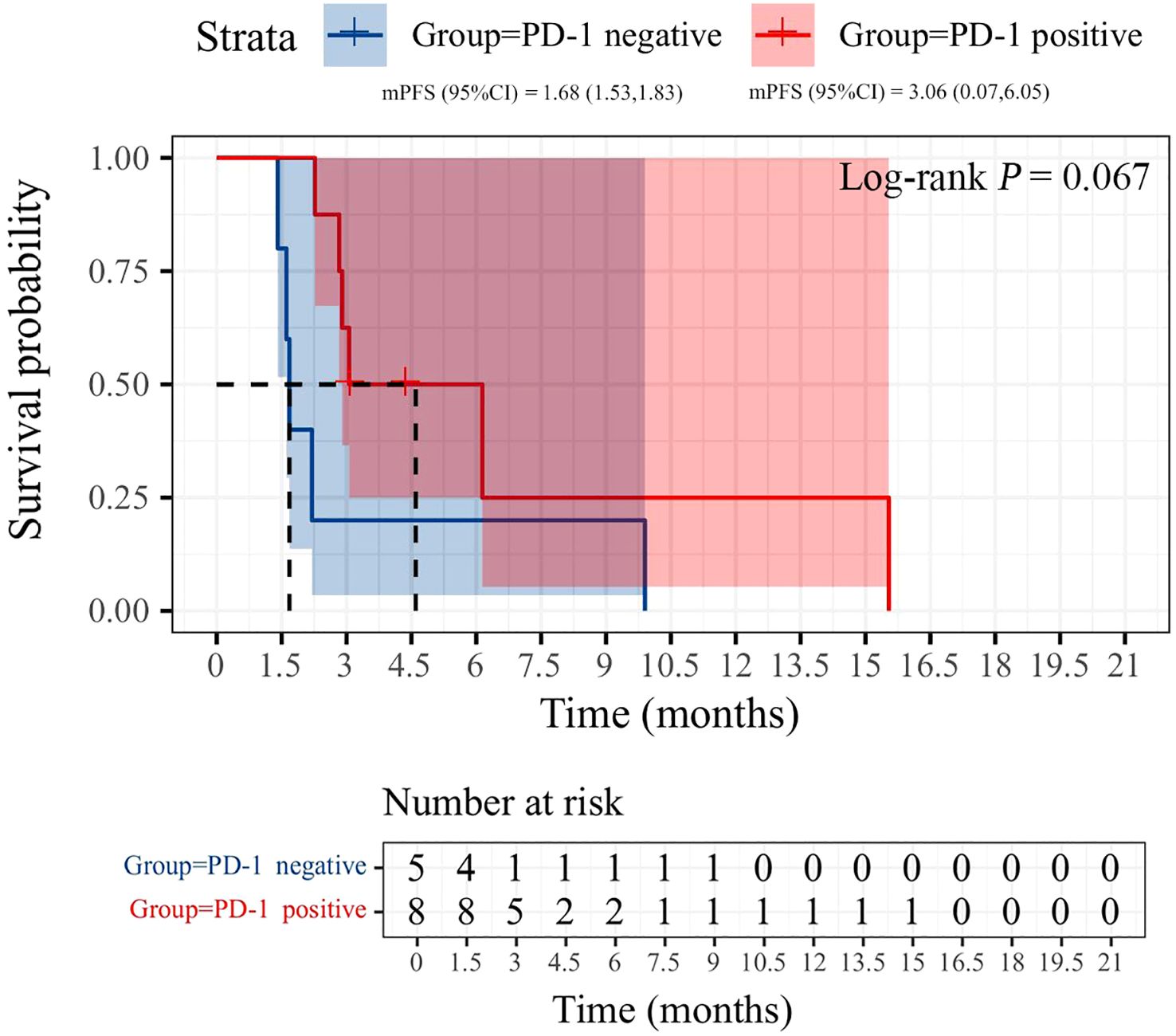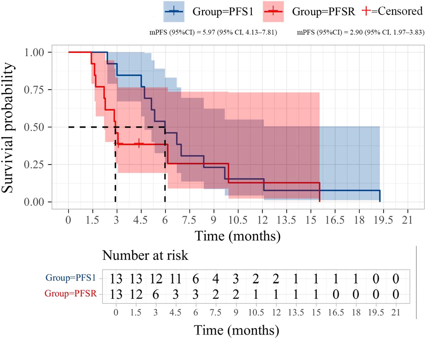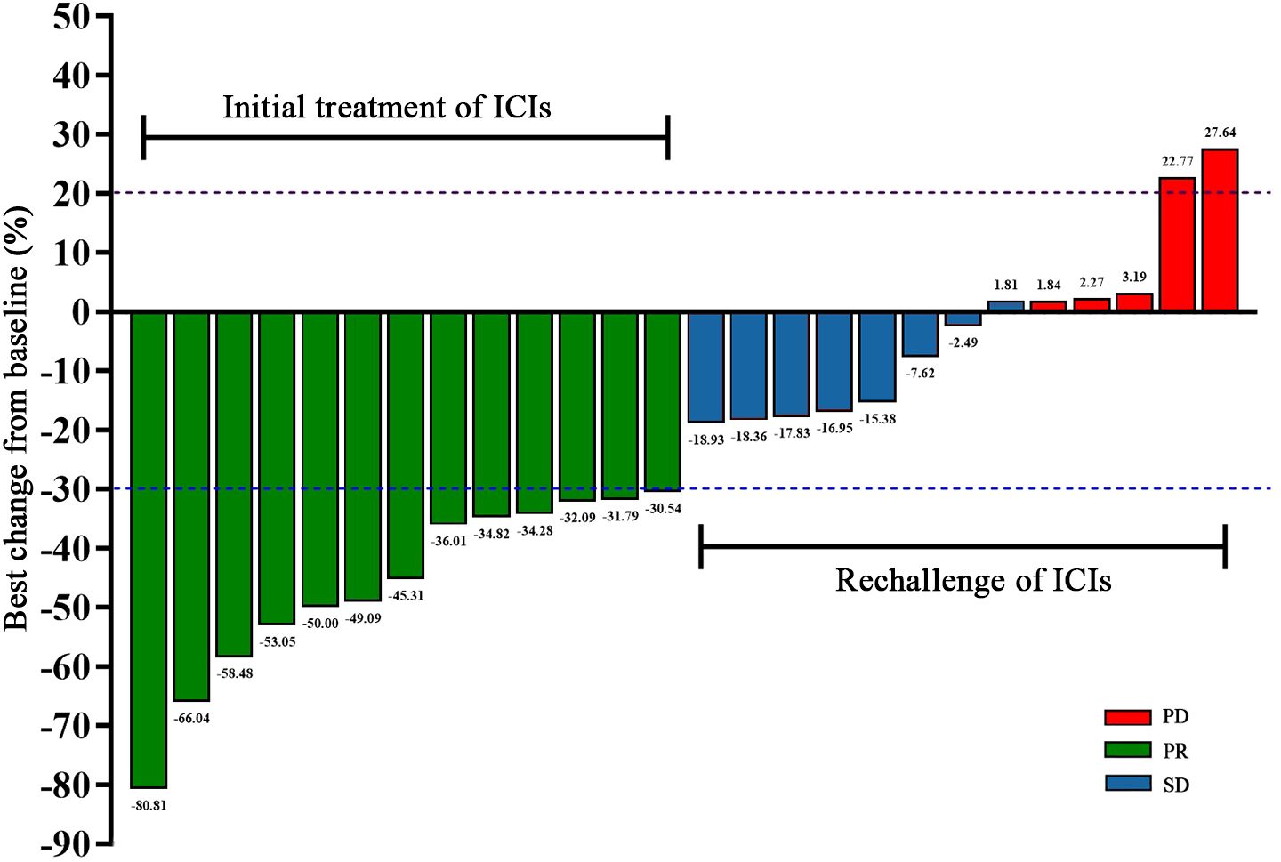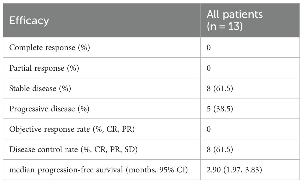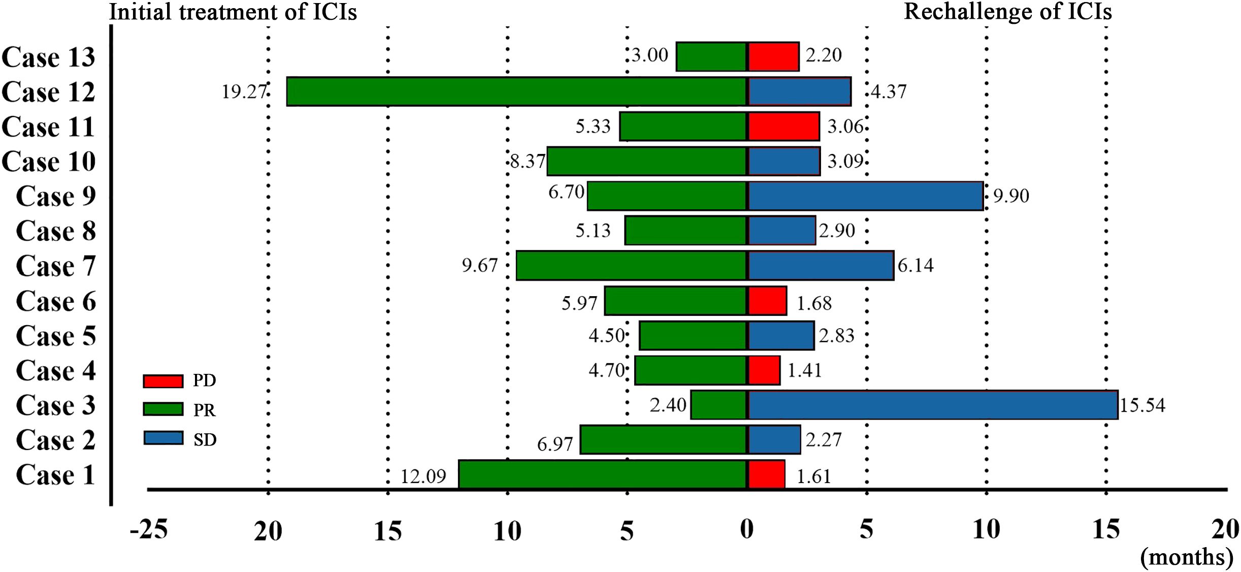 After the initial ICIs treatment, all patients achieved PR, with a median PFS of 5.97 months (95% CI, 4.13–7.81; Figure 1). Following the rechallenge of ICIs, 8 patients (61.5%) achieved SD, while 5 patients (38.5%) experienced PD. The DCR was 61.5%, while the ORR was 0% (Table 2). The median PFS was 2.90 months (95% CI, 1.97-3.83; Figure 1). The overall response of target lesions in the entire cohort following both the initial ICIs treatment and the rechallenge of ICIs is illustrated in Figure 2, and the PFS results are presented in Figure 3. OS data were immature.