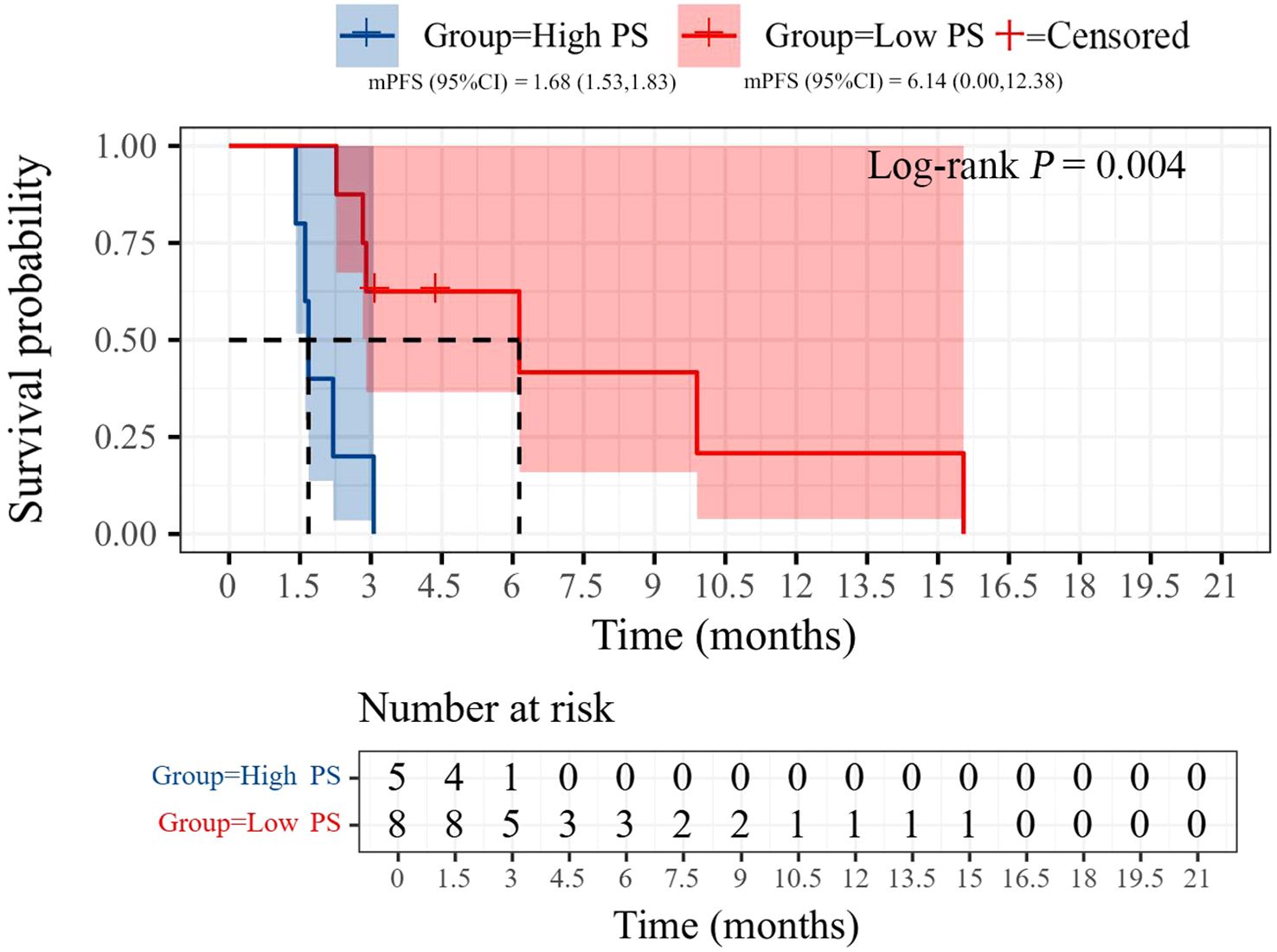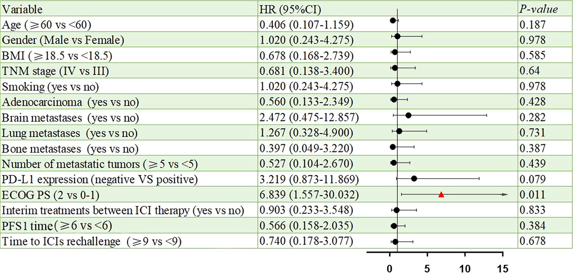 All patients were categorized into two subgroups based on PD-L1 status and PS score. As illustrated in Figure 4, the PFS of the low PS group was significantly longer than that of the high PS group, with durations of 6.14 months and 1.68 months, respectively (p = 0.004). In contrast, no significant difference in PFS was observed between the two groups when stratified by PD-L1 status (Figure 5). Furthermore, univariate analysis of patient data revealed that ECOG-PS of 2 was significantly associated with PFS, exhibiting an HR of 6.839 (95% CI: 1.557–30.032, p = 0.011) as shown in Figure 6.