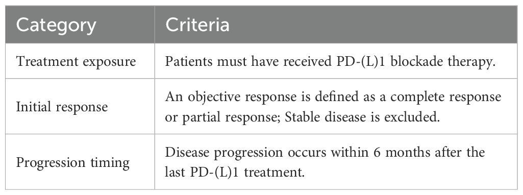 Although ICI-based therapies have become the standard first-line option for these patients, less than 50% exhibit a response to initial IO (5, 6), and 65% of those who initially respond will experience disease progression (PD) due to IO resistance within four years (7, 8). Follow-up treatment options for these patients are significantly limited, and there is a notable lack of optimal treatment strategies. At present, the predominant approach focuses on extending these patients’ survival through various combination therapies, which may include other immunotherapeutic agents, chemotherapy, anti-angiogenic drugs, and radiotherapy (9). Among these, immune rechallenge therapy has garnered attention from numerous experts and scholars as a viable and promising treatment strategy (10). However, before considering the rechallenge of ICIs in advanced NSCLS patients, it is crucial to distinguish between primary immune resistance (PIR) and acquired immune resistance (AIR), as the mechanisms underlying these forms of resistance differ (11). These mechanisms include alterations in β2-microglobulin, interferon-γ (IFN-γ) signaling, neoantigen loss, tumor-mediated immunosuppression/exclusion, and additional inhibitory checkpoints (12). PIR refers to the failure to respond to initial IO, leading to PD, while AIR indicates an initial response to IO followed by subsequent PD (7). Notably, a significant challenge in lung cancer IO is the absence of a unified standard for AIR. Furthermore, the incidence of AIR in lung cancer is notably higher than in other tumors (7). To address this clinical challenge, Schoenfeld et al. (12) proposed a definition of AIR that aligns more closely with clinical practice for advanced NSCLC patients, as follows: 1. Prior treatment with IO; 2. Objective response to PD(L)-1 blockade (stable disease (SD) is excluded); and 3. Progression occurring within 6 months of the last PD(L)-1 blockade therapy (Table 1). To identify patients suitable for ICIs rechallenge therapy, we adopted this new criterion of immune resistance and conducted a retrospective analysis of the relationship between the clinical characteristics of NSCLC patients and the efficacy of ICIs rechallenge.