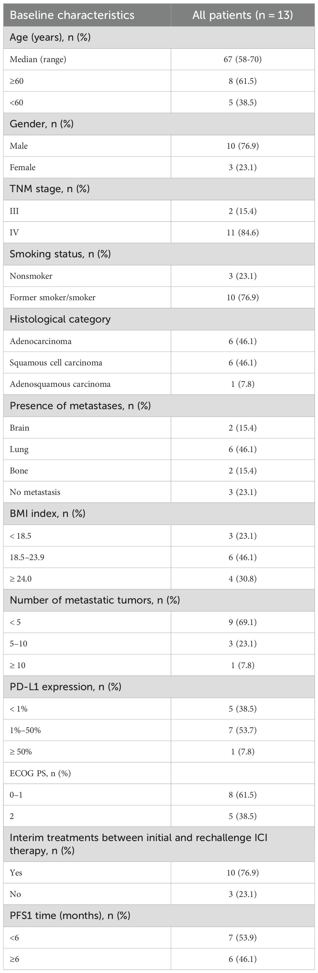 A total of 13 patients with advanced NSCLC lacking targetable gene mutations and diagnosed with AIR underwent immune rechallenge therapy. The median age of the cohort was 67 years (range: 58-70), with 10 patients (76.9%) being male and 10 patients (76.9%) having a history of smoking. According to the 8th edition of the TNM classification for lung cancer, 2 patients (15.4%) were classified as stage III, while 11 patients (84.6%) were classified as stage IV. Histological analysis revealed that 6 patients (46.1%) had squamous cell carcinoma, 6 patients (46.1%) had adenocarcinoma, and 1 patient (7.8%) had adenosquamous carcinoma. Among the patients, 6 (46.1%) had lung metastases, 2 (15.4%) had brain metastases, and 2 (15.4%) had bone metastases. Additionally, 5 patients (38.5%) exhibited negative PD-L1 expression, and 5 patients (38.5%) had an ECOG PS of 2. Most patients received interim treatments between initial and rechallenge ICIs therapy. Table 3, Appendix 1 and Appendix 2 present the characteristics of the patients.
