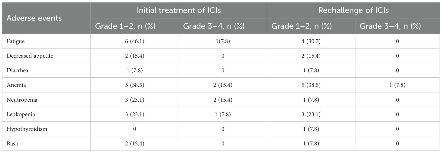 Adverse events are summarized in Table 4. During the initial treatment with ICIs, the most common adverse events were fatigue (6 patients, 46.1%) and anemia (5 patients, 38.5%). Grade 3–4 events included anemia and neutropenia (2 patients each, 15.4%), leukopenia (1 patient, 7.8%), and fatigue (1 patient, 7.8%).In the ICIs rechallenge phase, anemia (5 patients, 38.5%) and fatigue (4 patients, 30.7%) remained the most frequently reported adverse events. However, only one Grade 3–4 event was observed, which was anemia (1 patient, 7.8%).