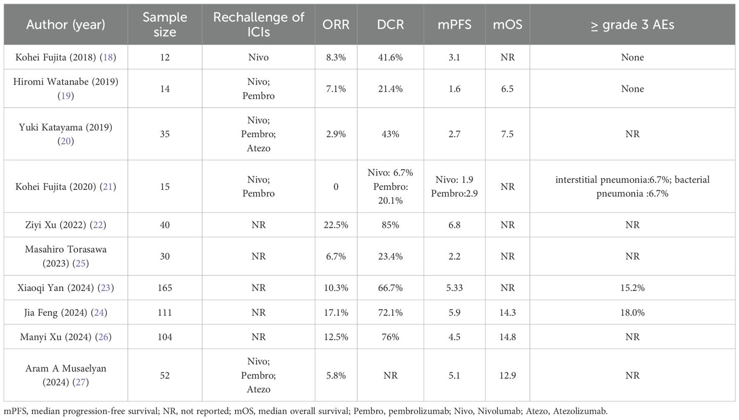 Efficacy endpoints included progression-free survival (PFS), defined as the time from the initiation of study treatment to PD or death from any cause; overall survival (OS), defined as the time from the first day of the second ICIs administration to the date of death or the last follow-up date; overall response rate (ORR), defined as the proportion of patients achieving a complete response (CR) or partial response (PR); and disease control rate (DCR), defined as the proportion of patients with CR, PR, or SD according to the Response Evaluation Criteria in Solid Tumors (RECIST) version 1.1. The PFS for ICI-based therapy (PFS1) refers to the time from the first administration of anti–PD-1/PD-L1 blockade therapy to PD, while the PFS for ICIs rechallenge regimens (PFSR) refers to the time from immune rechallenge to PD. Patients without documented clinical or radiographic disease progression, or those who remained alive, were censored at the last follow-up date. Adverse events (AEs) were graded according to the National Cancer Institute Common Terminology Criteria for Adverse Events version 4.0 (NCI-CTCAE v4.0).