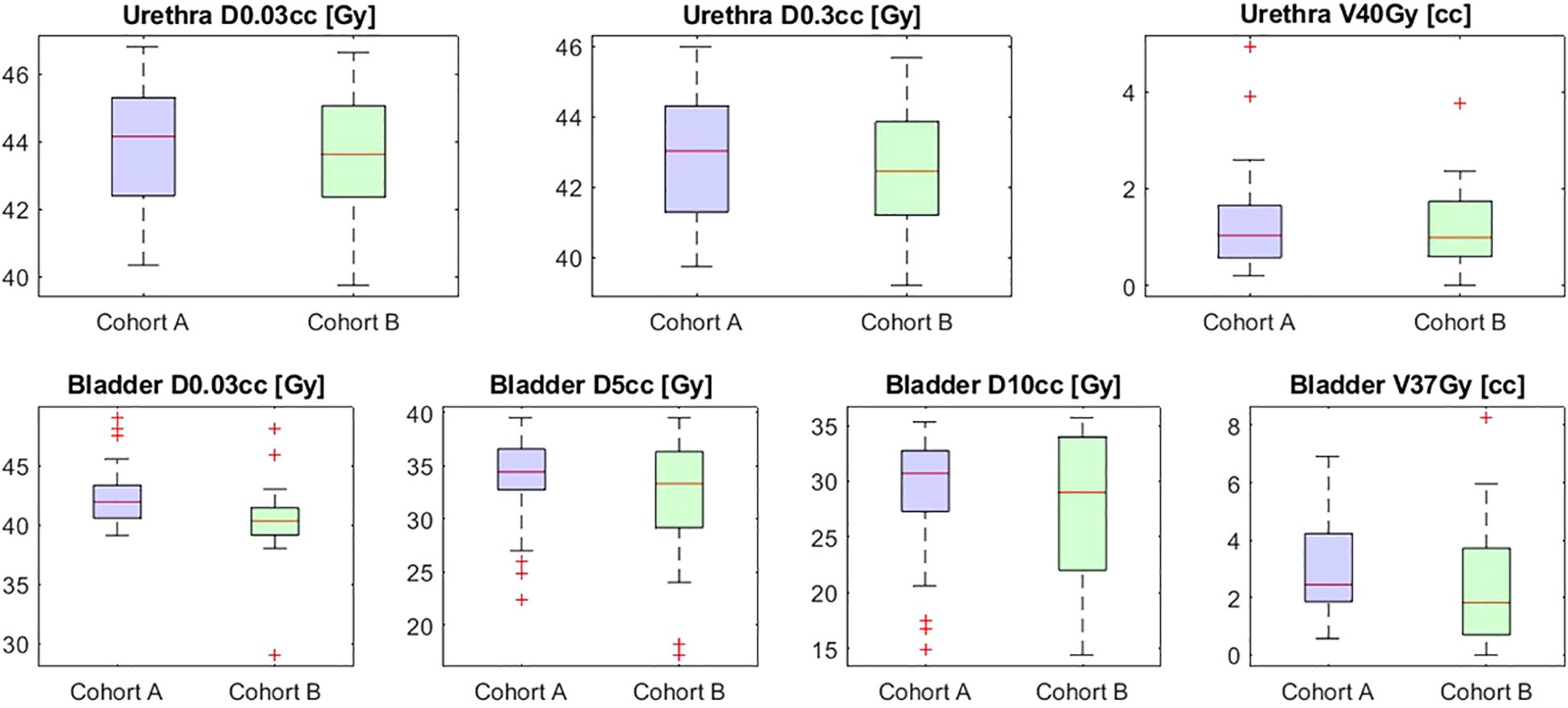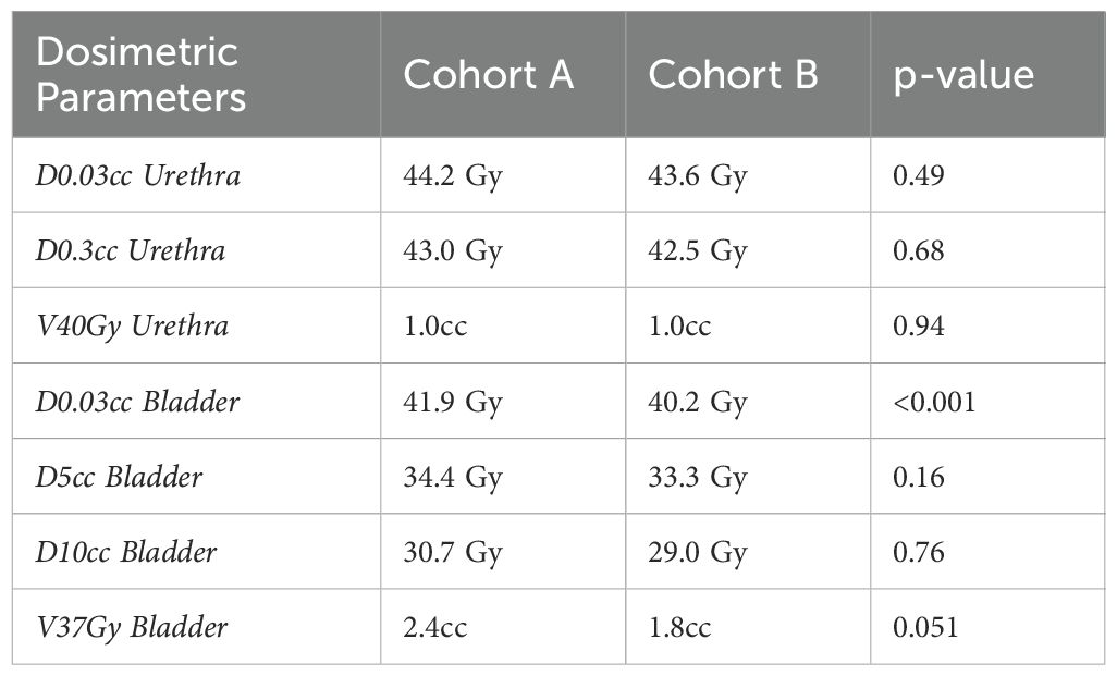 Bladder D0.03cc was significantly higher in cohort A compared to cohort B (41.9 Gy vs 40.2 Gy; p < 0.001). No significant differences were observed in other bladder parameters (D5cc, D10cc, and V37Gy). Similarly, urethral parameters such as D0.03cc (44.2 Gy vs 43.6 Gy; p = 0.49) and V40Gy (1.0 cc vs 0.99 cc; p = 0.94) showed no significant differences between cohorts. These results are summarized in Table 2 and Figure 2 below.