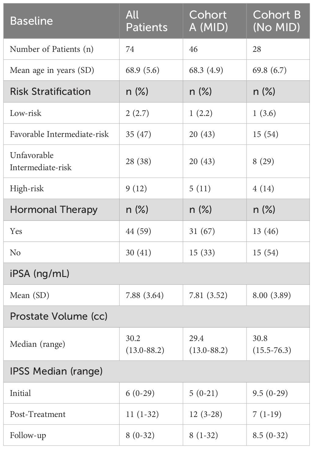 Results: Of the 74 patients, 46 (62%) experienced MID in scores (cohort A), while 28 (38%) did not (cohort B). Patient characteristics in the two cohorts such as risk stratification and initial PSA were well-balanced. Median IPSS for cohort A were 5 (range: 0–21) pre-treatment, 12 (range: 3–28) post-treatment, and 8 (range: 1–32) at 12 months. For cohort B, the scores were 9.5 (range: 0–29), 7 (range: 1–19), and 8.5 (range: 0-32), respectively. In addition, there was a statistically significant difference in D0.03cc to the bladder in cohort A compared to cohort B (41.9 Gy vs 40.2 Gy; p < 0.001).