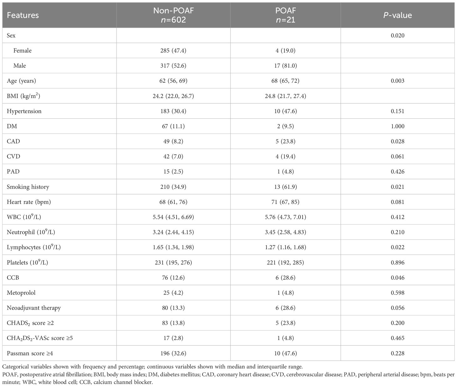 The differences in the clinical features between patients in different groups or cohorts were compared using the Student’s t-test or Mann–Whitney U test for continuous variables and the chi-squared test for categorical variables, as appropriate. Clinical features potentially associated with POAF (P<0.05) were then included in the multivariate logistic regression analysis to identify the independent risk factors.