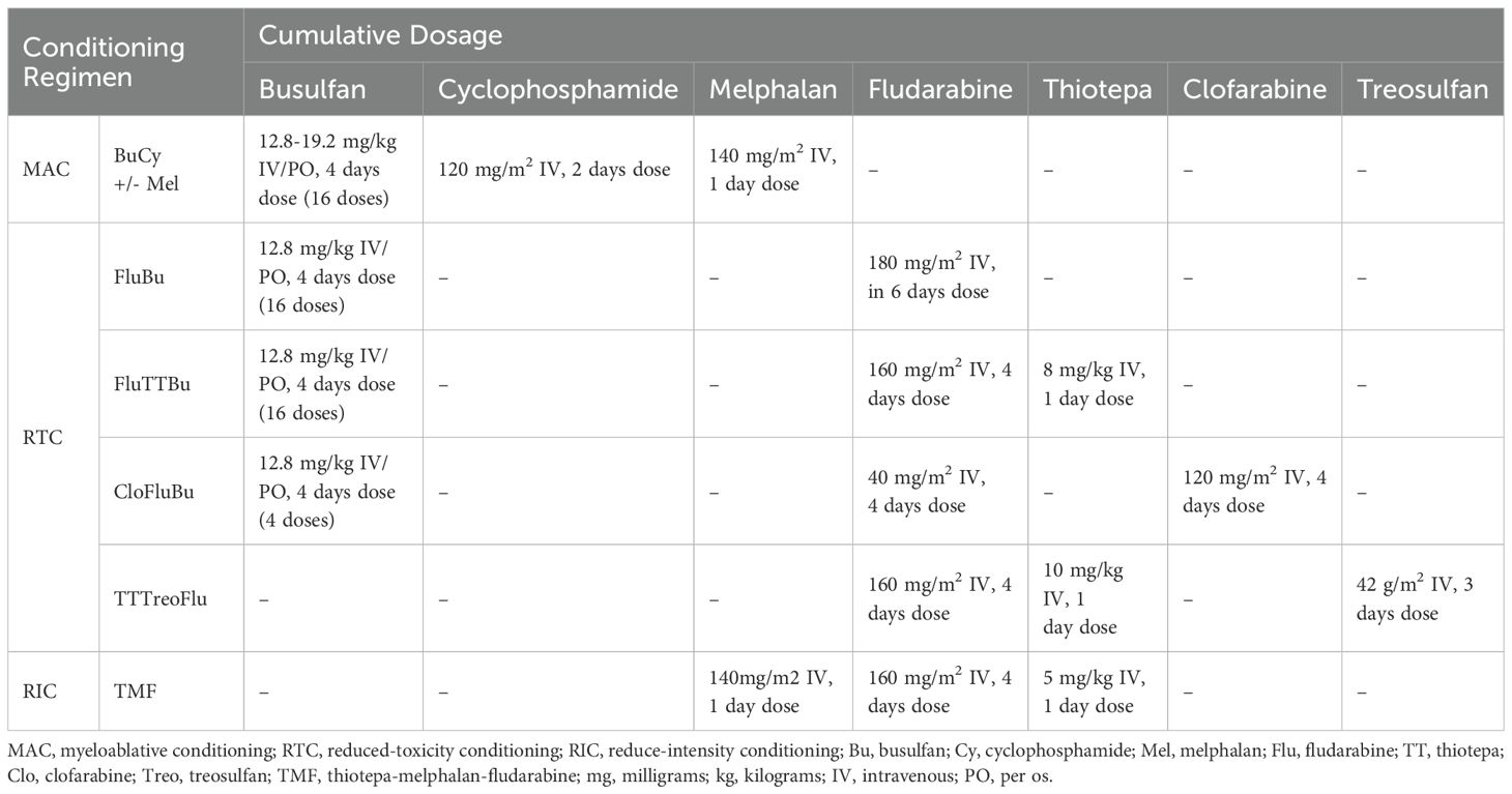 RTC regimens use tailored dosing and agents like fludarabine, clofarabine, and/or treosulfan to minimize regimen-related toxicity while preserving antileukemic efficacy. The substitution of cyclophosphamide with fludarabine has shown comparable outcomes (19). However, there are reports of shorter 2-year OS with BuFlu compared to BuCy (61% vs 71%, p = 0.01), mainly due to poorer post-relapse survival, independent of pre-HSCT disease status (20). Clofarabine, with its enhanced synergy and tolerability, has been increasingly adopted in CloFluBu regimens, associated with lower rates of aGvHD, especially cutaneous and hepatic toxicity (12). Treosulfan offers a more favorable safety profile than busulfan, with improved early gastrointestinal tolerability, reduced relapse and transplant-related mortality (21–24). RTC aims to preserve efficacy while minimizing MAC-related toxicity, with the goal of improving survival outcomes and quality of life.