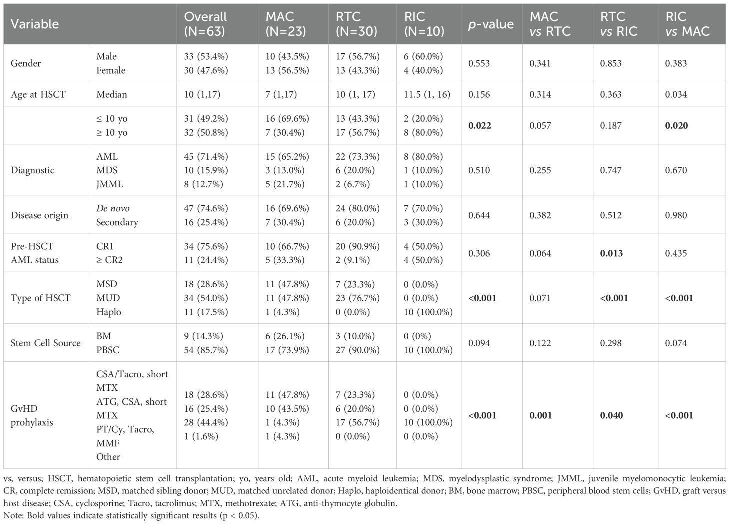 The study cohort included 59 pediatric patients undergoing allogeneic HSCT for myeloid malignancies, four of which received second transplant, yielding a total of 63 datapoints. The general characteristics of the cohort are presented in Table 2. Overall sex ratio was balanced (1:1), and the median age at transplant was 10 years (range 1–17 years). Age distribution varied across conditioning regimens with 69.6% of MAC patients <10 years compared to only 20.0% in RIC (p = 0.009, Pearson Chi-Square; p = 0.020, Fisher’s Exact Test).