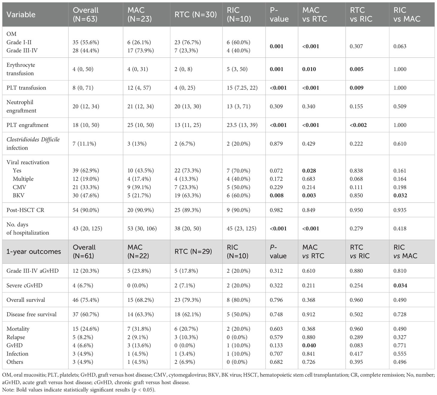 Methods: Primary objectives evaluated graft versus host disease (GvHD), relapse, overall survival (OS), disease-free survival (DFS), and mortality causes. Secondary endpoints assessed early complications such as mucositis, engraftment kinetics, viral reactivation, and hospitalization duration. A subgroup analysis compared fludarabine- and clofarabine-based RTC regimens.