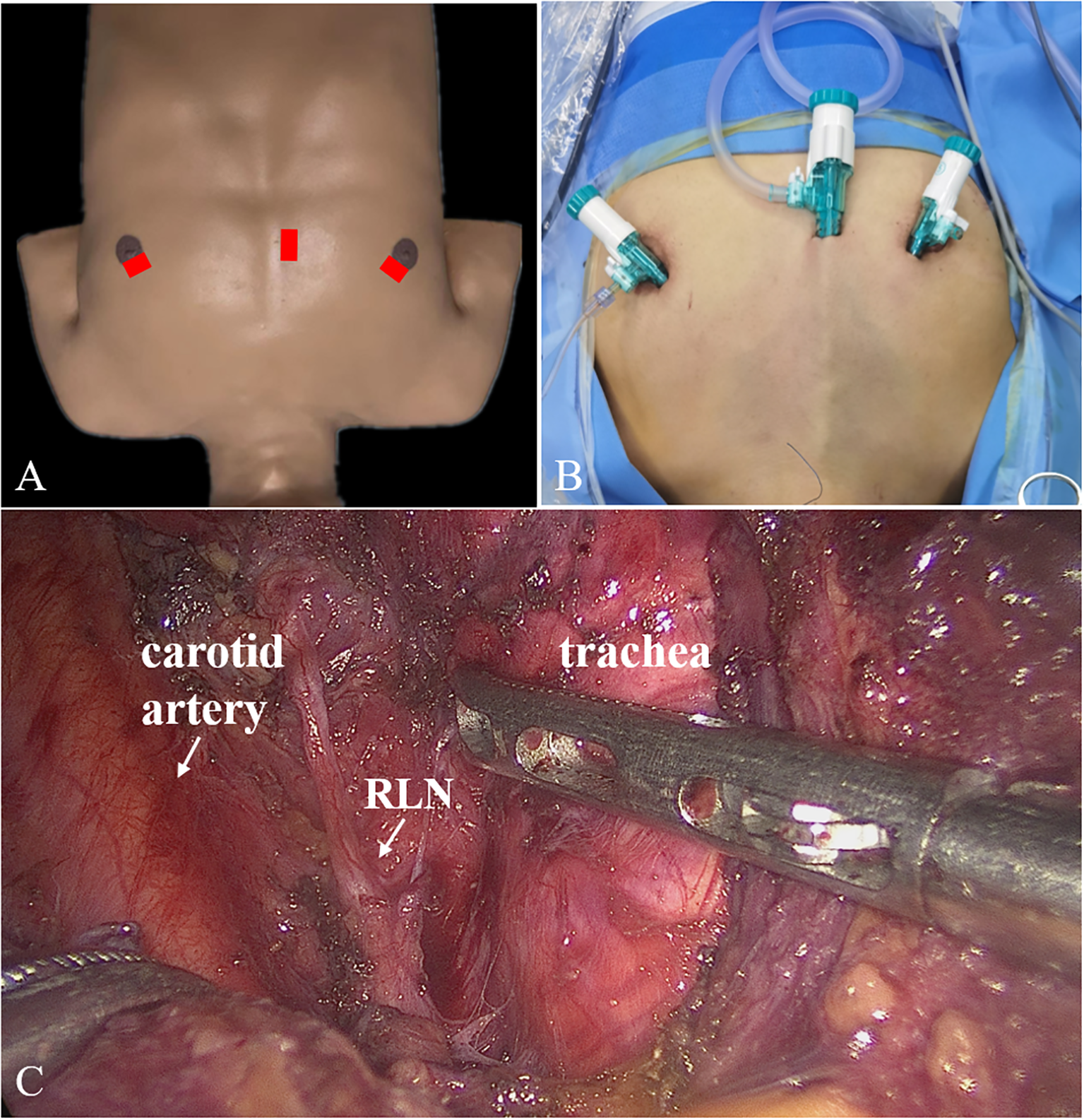 First, a 10-mm trocar was set at nipple level next to the sternum. Two 5-mm trocars were positioned at 10–11 o’clock on the left areola and 1–2 o’clock on the right areola (Figure 1). Second, we established the initial working space, bounded superiorly by the larynx, inferiorly by the sternal notch, and laterally by the middle edges of the sternocleidomastoid. Third, the linea alba cervicalis was divided to reveal the thyroid, the isthmus was separated from the surface of the trachea and transected, the thyroid was retracted medially, and the carotid artery was exposed on the outside. Fourth, the upper pole of the gland was dissected and the superior thyroid vessels were ligated with the preservation of the superior laryngeal nerve and superior parathyroid gland. Fifth, the inferior thyroid vessel was ligated and the thyroid was cut close to the capsule to preserve the recurrent laryngeal nerve (RLN) and inferior parathyroid gland. Sixth, the thyroid lobe was removed completely. The contralateral thyroid lobe was also removed when necessary. Finally, the lymph nodes in the central region were dissected.
