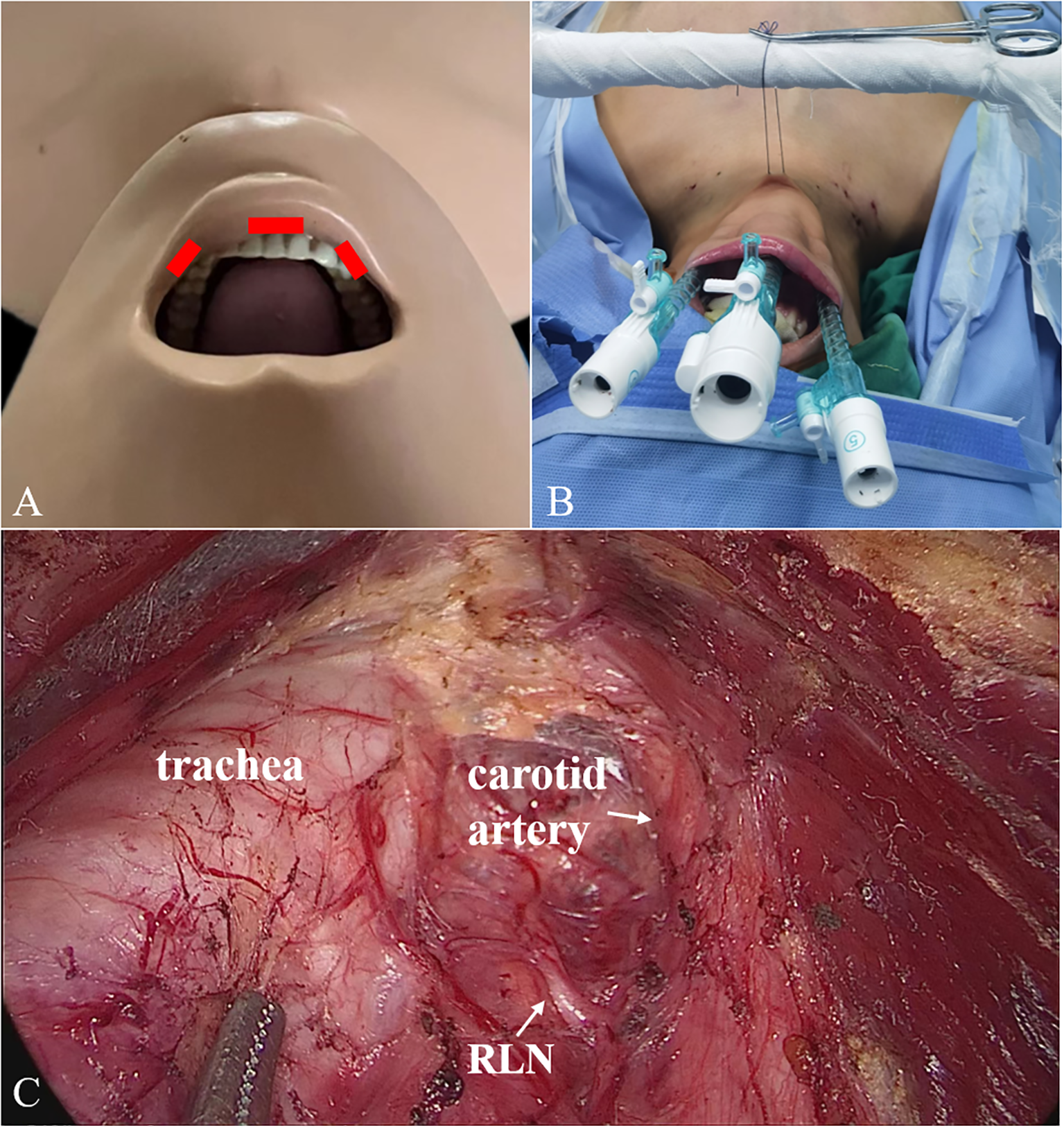 2 Trocars placement (A, B) and surgical scene (C) for TOETVA. TOETVA, transoral endoscopic thyroidectomy vestibular approach.