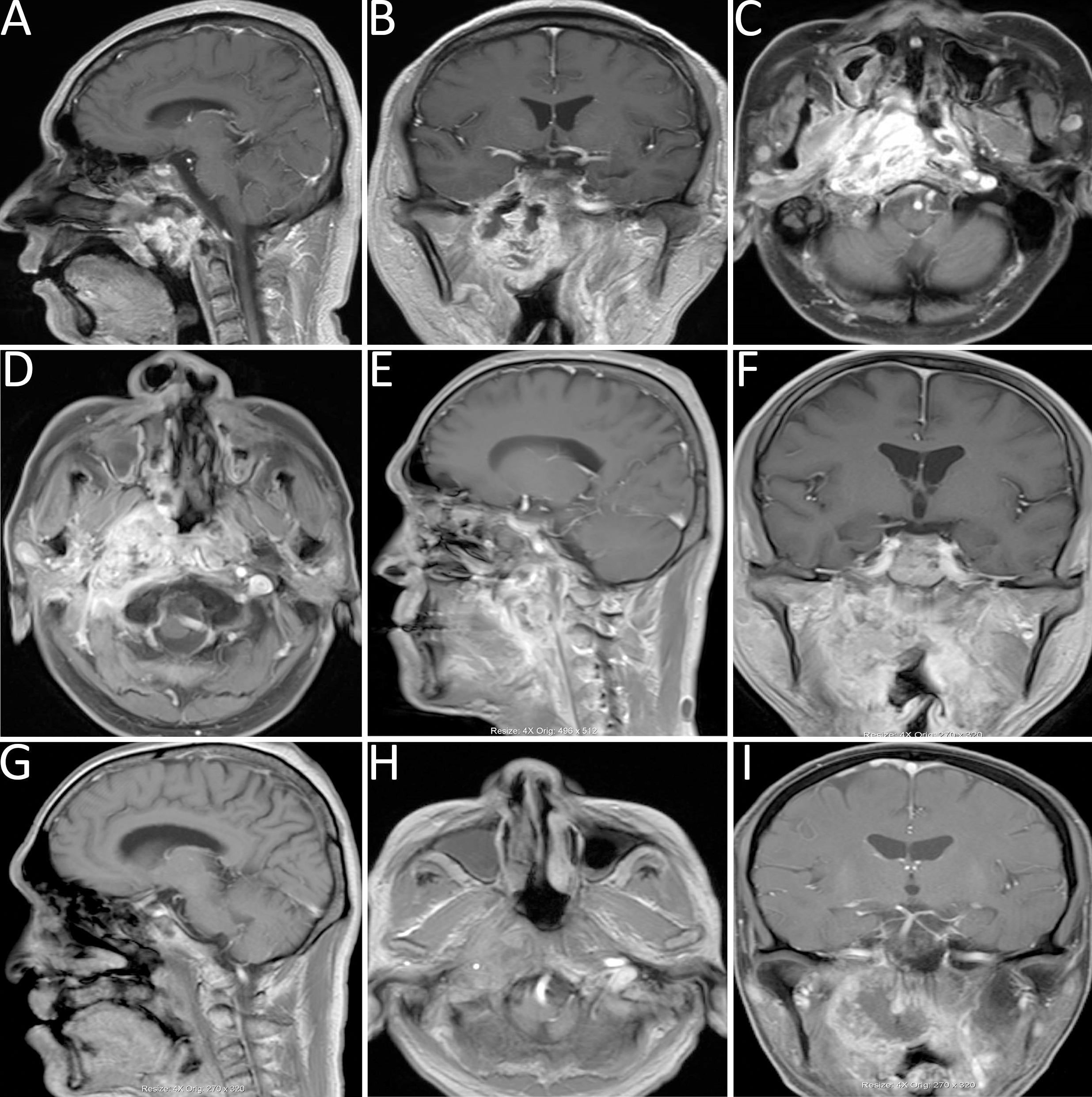 (A-C) Head MRI demonstrated abnormal signal intensities in the nasopharyngeal roof and right parapharyngeal space, with heterogeneous contrast enhancement and linear enhancement at the margin of the left nasopharyngeal wall. (D-F) MRI revealed a space-occupying lesion in the right parapharyngeal space. (G-I) Follow-up MRI indicated marked liquefaction and necrosis within the surgical cavity, reduction of the primary lesion, and findings consistent with a partial response (PR).
