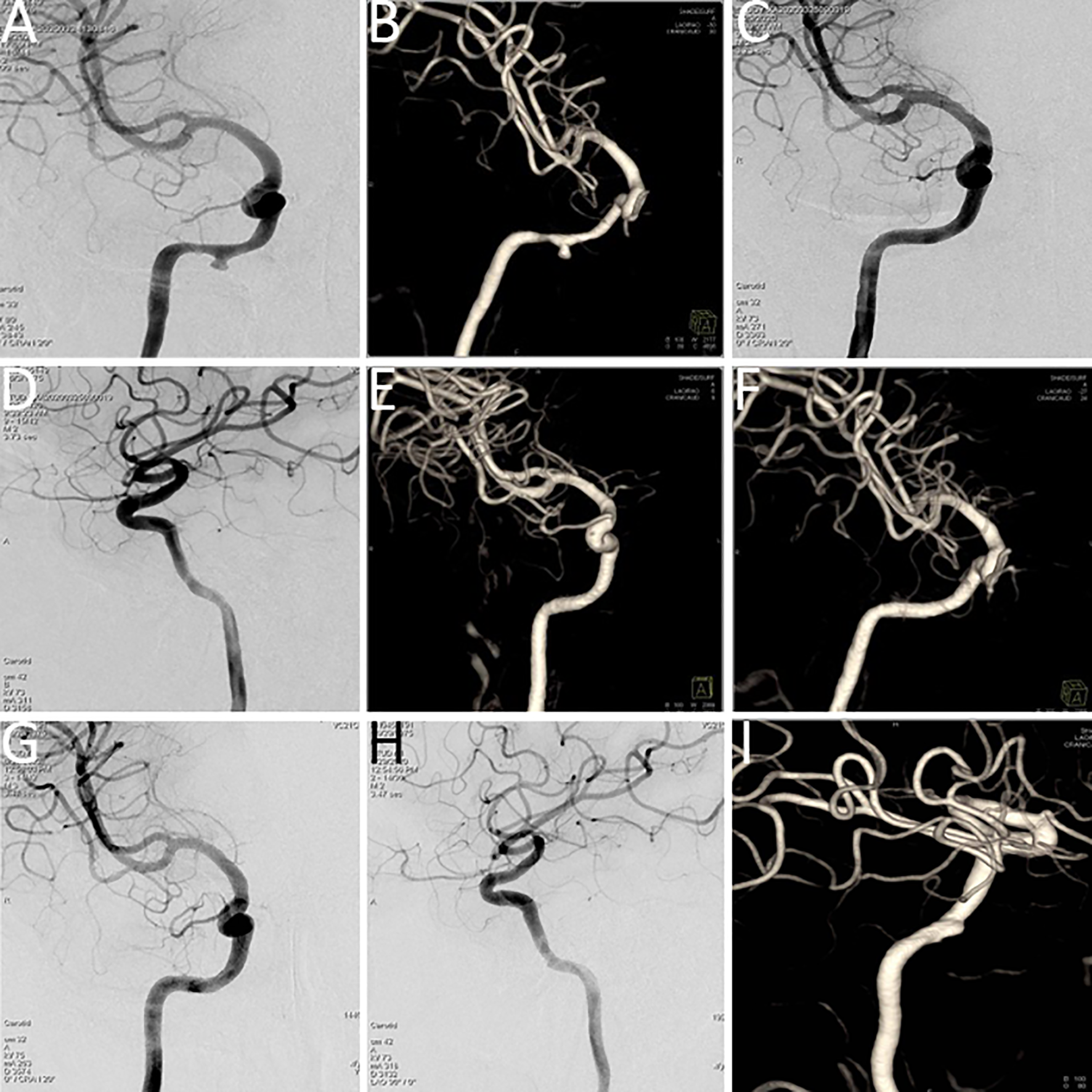 (A, B) Digital subtraction angiography (DSA) indicated a pseudoaneurysm in the petrous segment of the right internal carotid artery, with tumor-related narrowing; the balloon occlusion test was positive. (C, D) Post–covered stent implantation DSA showed disappearance of the pseudoaneurysm, restoration of normal vascular morphology, and adequate perfusion of intracranial branch arteries. (E, F) Vascular reconstruction after stent implantation confirmed favorable vascular morphology and intracranial branch perfusion. (G, H) Follow-up DSA indicated recurrence of a small aneurysm distal to the stent in the petrous segment (C2) of the right internal carotid artery. (I) Vascular reconstruction angiography at three months post-stent implantation demonstrated a dissecting aneurysm.