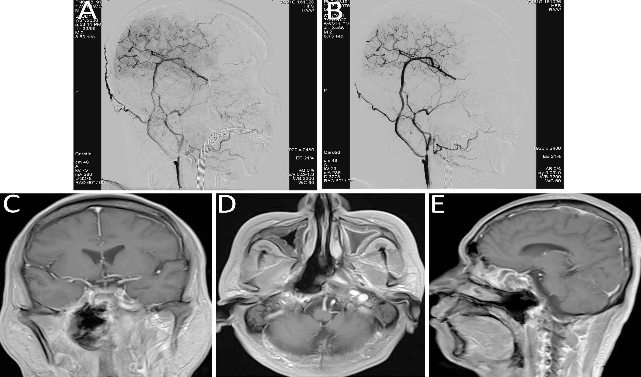 (A, B) Immediate post-bypass angiography confirmed patency of the bypass graft, with sufficient perfusion of the right middle cerebral artery and retrograde supply to the ophthalmic artery. No perfusion was observed in the right internal carotid artery at the cervical (C1), petrous (C2), and cavernous (C4) segments. (C–E) Follow-up head MRI demonstrated significant tumor shrinkage and satisfactory local disease control.