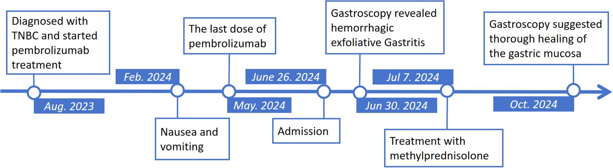 The patient is a 44-year-old woman who was admitted to the hospital with “nausea and vomiting for more than 4 months”, accompanied by anorexia, upper abdominal pain, without obvious black stools or blood in the stool. She was diagnosed with TNBC 10 months ago, and was treated with totally 12 cycles of Pembrolizumab (the last dose was administered one month ago). She was diagnosed with Helicobacter pylori (Hp) infection but remained untreated for one year and had been diagnosed with psoriasis for many years. She denied any consumption of non-steroidal anti-inflammatory drugs (NSAIDs), alcohol, or narcotics, and she did not have a past history of diabetes mellitus or hypertension.