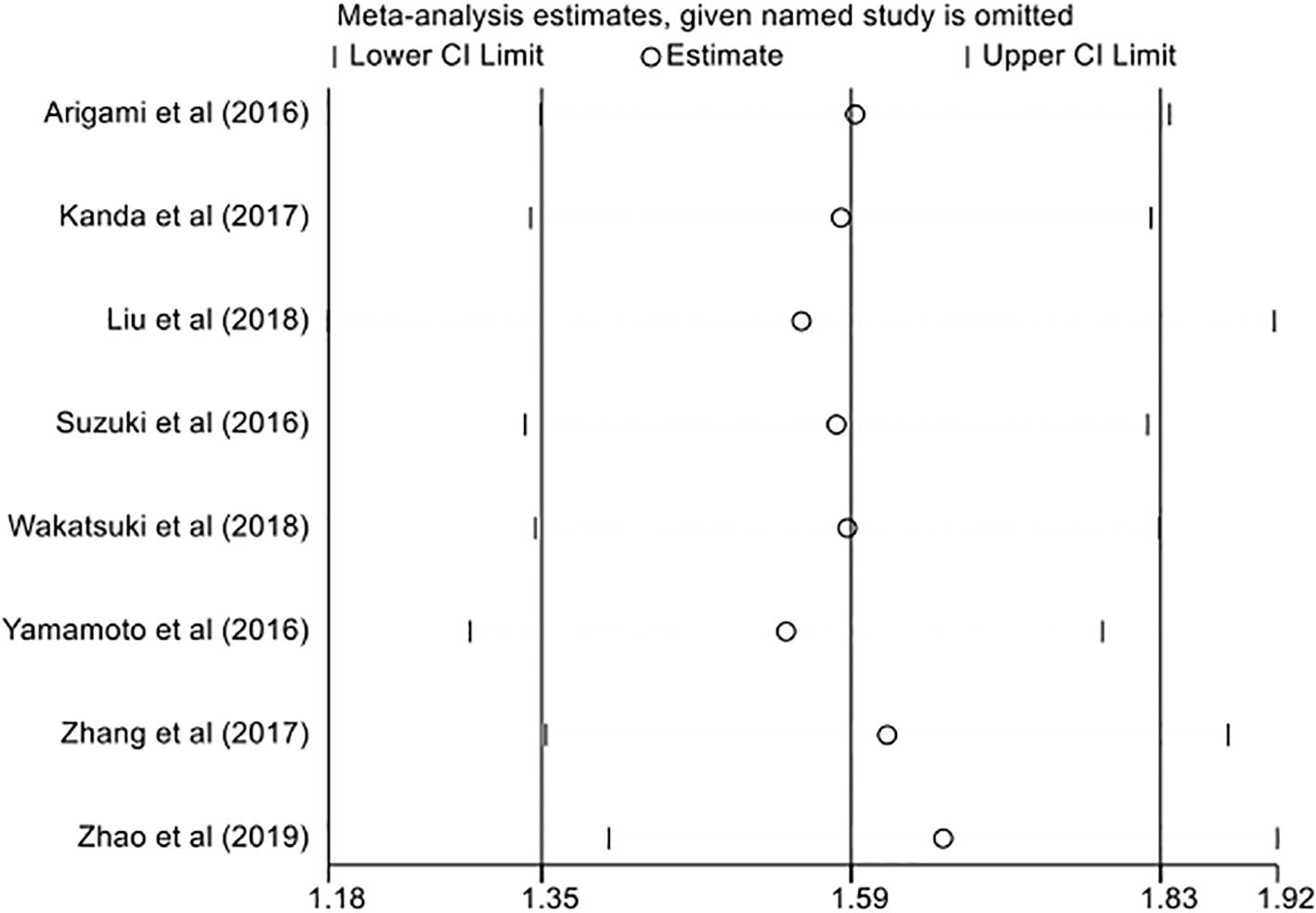 Figure 4. Sensitivity analysis of overall survival (OS) showing the effect of sequential omission of individual studies on the pooled hazard ratio estimates.