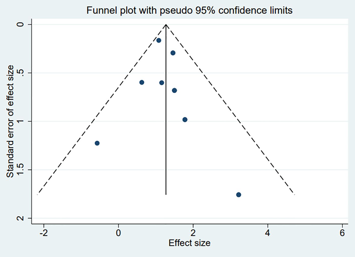 The funnel plots constructed in the observed study showed symmetry, and no significant publication bias was detected in the funnel plots (Figure 5). Egger’s linear regression test indicated that no significant publication bias was detected in the meta-analyses under different variables (P > 0.05), thus further confirming the robustness of the meta-analysis results.