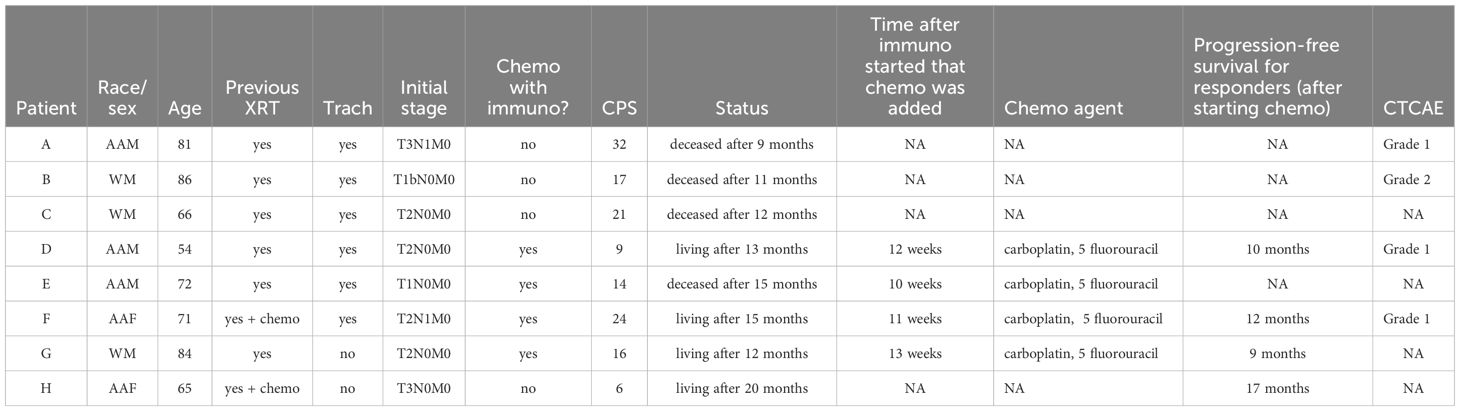 Methods: 8 patients with recurrent larynx cancer declined salvage laryngectomy. They were started on immunotherapy alone. We recorded their demographics, initial cancer stage, initial cancer treatment, combined positive score (CPS) values, need for tracheostomy, addition of chemotherapy to their immunotherapy, and response to therapy.
