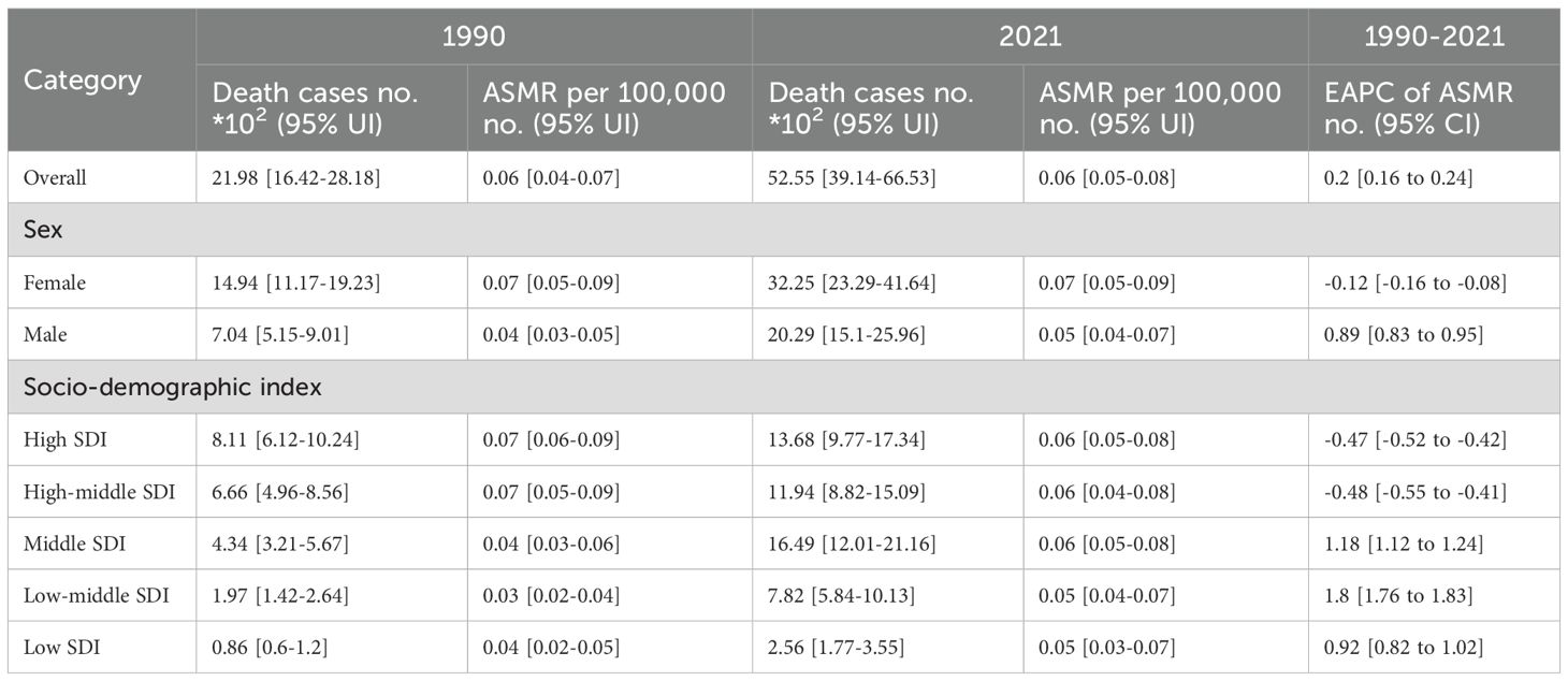 From 1990 to 2021, the number of thyroid cancer deaths worldwide increased from 2,198 to 5,255, a significant increase. Although the death toll increased, the ASMR remained unchanged, indicating that although the death toll increased, the age-standardized mortality rate did not change. The number of female deaths increased from 1,494 to 3,225, showing a significant upward trend, but the ASMR remained unchanged (0.07 per 100,000 people in 1990 and 2021), and the average annual change rate EAPC was -0.12%, indicating that the ASMR of women decreased year by year. This may be related to the change of the average age structure of women, which leads to the decline of the average mortality rate. The number of male thyroid cancer deaths increased from 704 to 2,029, which was significantly higher. The ASMR increased from 0.04 to 0.05 per 100,000, with an average annual change rate of 0.89%, indicating that the mortality rate of male population increased year by year, which may be related to the increase in the incidence of male thyroid cancer. The number of deaths in high SDI areas increased from 811 to 1,368, and the ASMR decreased from 0.07 to 0.06 per 100,000 people, with an average annual change rate of -0.47%, indicating that the mortality rate in high SDI areas is decreasing year by year. The number of deaths in high-middle SDI increased from 666 to 1,194, and the ASMR decreased from 0.07 to 0.06 per 100,000 people, with an average annual change rate of -0.48%, and the mortality rate decreased. The number of deaths in the middle SDI area increased from 434 to 1,649, and the ASMR increased from 0.04 to 0.06 per 100,000 people, with an average annual change rate of 1.18%, and the mortality rate increased. The number of deaths in low-middle SDI area increased from 197 to 782, and ASMR increased from 0.03 to 0.05 per 100,000 people, with an average annual change rate of 1.8%, and the mortality rate increased. The number of deaths in low SDI areas increased from 86 to 256, and the ASMR increased from 0.04 to 0.05 per 100,000 people, with an average annual change rate of 0.92%, and the mortality rate increased slightly. (See Table 1).
