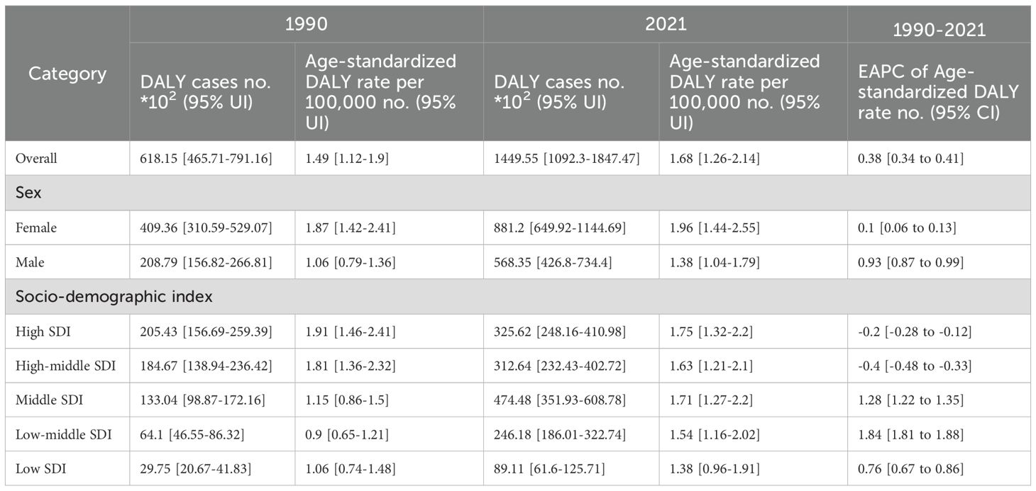 From 1990 to 2021, the number of DALY in the world increased from 61815 to 144955, a significant increase, reflecting the aggravation of the burden of illness. The AS-DALYs increased from 1.49 per 100,000 people (95% confidence interval 1.12 to 1.9) to 16.8 per 100,000 people (95% confidence interval 1.26 to 2.14), indicating that although the absolute burden of illness increased, the burden of illness standardized by age structure increased, and the health status of the whole population deteriorated. The average annual change rate (EAPC) is 0.38% (95% confidence interval is 0.34 to 0.41), which shows that DALY rate has increased year by year in the past 30 years. Grouped by gender, the pain burden of male group increased significantly, while the pain burden of female group increased, but the change was slow. According to the social and economic development level (SDI), the burden of illness in high SDI areas decreased slightly, while the burden of illness in medium SDI and low SDI areas increased significantly, especially in low SDI areas, with an average annual change rate of 0.76%, indicating that the burden of illness was on the rise but the increase was slow (See Table 2).