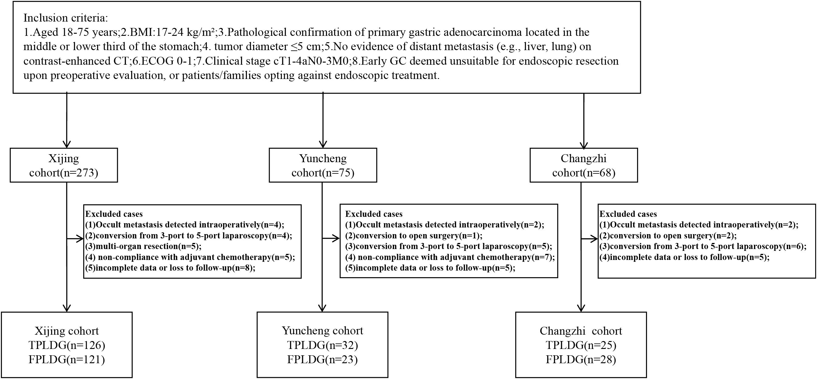 Conclusion: TPLDG achieves comparable oncological outcomes to conventional FPLDG while offering significant advantages in postoperative recovery and inflammatory response reduction. The left-sided three-port technique represents a viable standardized approach for RPLG, particularly suited for D2 lymphadenectomy in Asian populations.