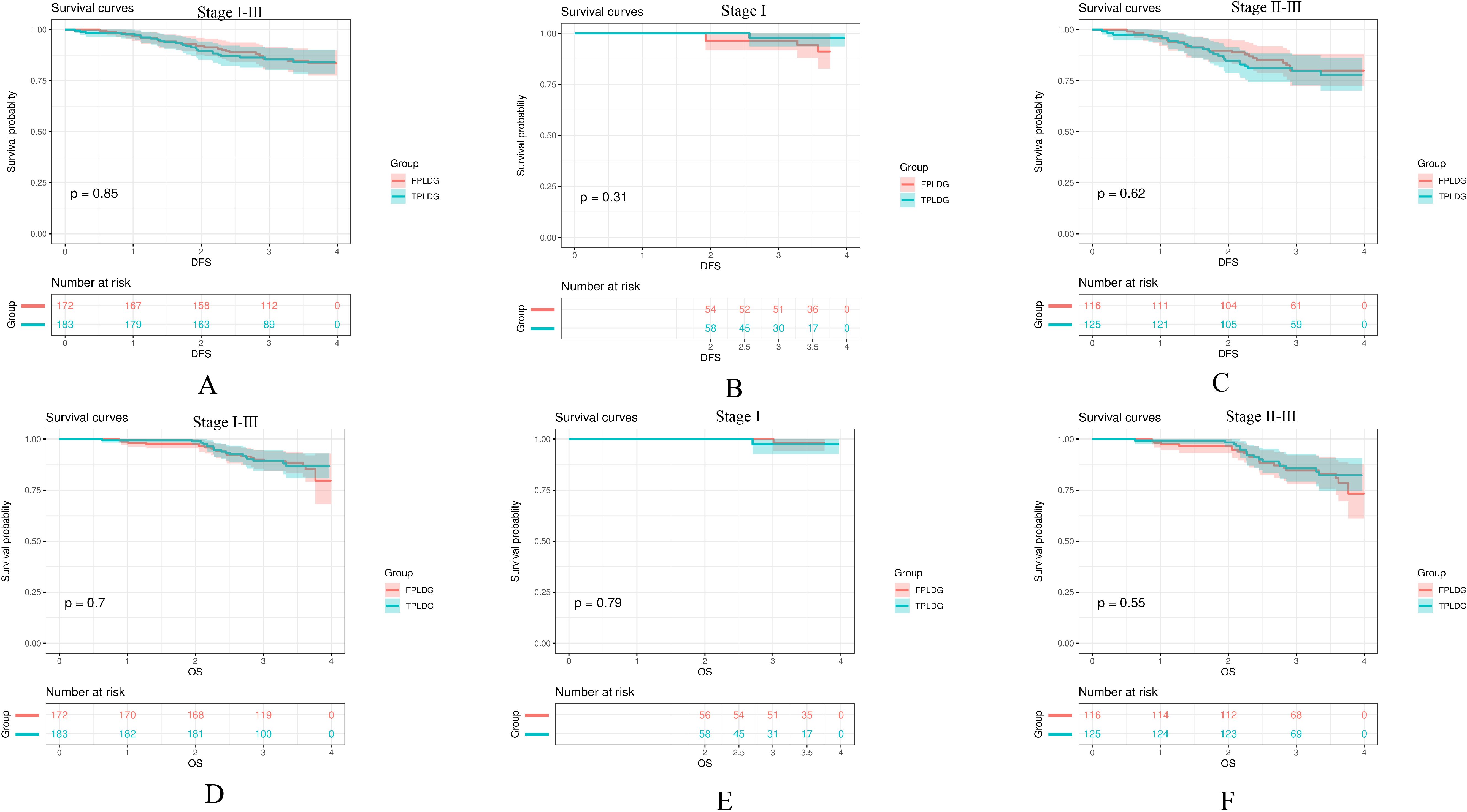 The 3-year DFS rates were 85.4% for the TPLDG group and 85.8% for the FPLDG group (p=0.85, Figure 2A), while the 3-year OS rates were 89.4% and 89.2%, respectively (p=0.70, Figure 2D). Given the significant influence of disease stage on prognosis, we performed a stratified survival analysis. As shown in Figures 2B, C, E, F, the survival curves were compared between the two groups across different pathological stages. No significant differences in DFS were observed in either stage I (p=0.31, Figure 2B) or stages II–III (p=0.62, Figure 2C). Similarly, OS did not differ significantly between the groups for stage I (p=0.79, Figure 2E) or stages II–III (p = 0.55, Figure 2F).