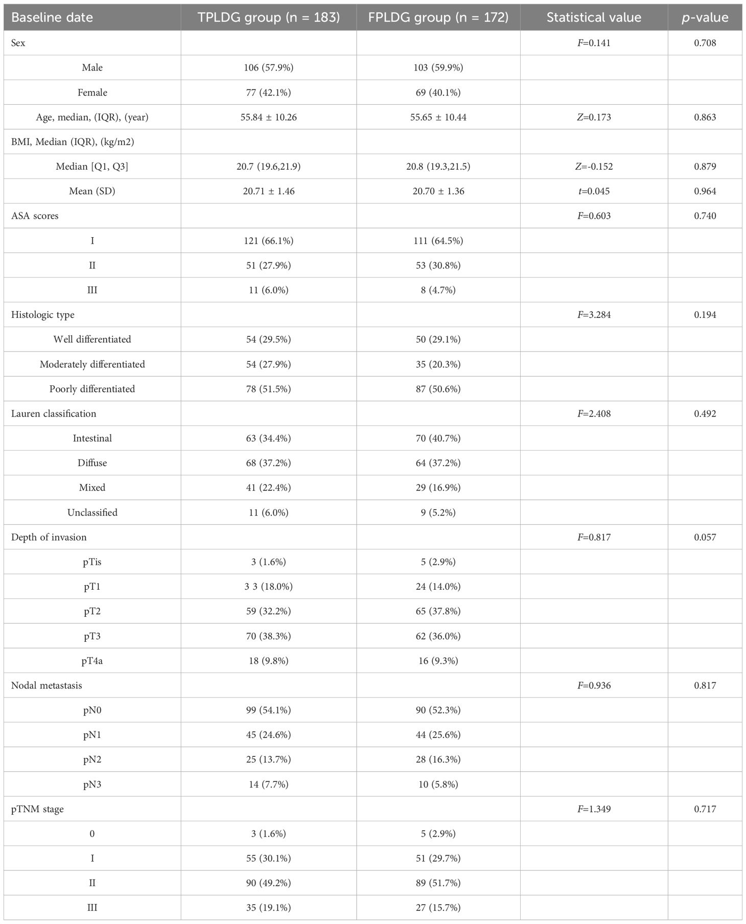 No significant differences were observed between the two groups regarding age, BMI, sex, ASA classification, tumor stage, histological type, or Lauren classification (Table 1). The operative time was 140 (125, 160) minutes in the TPLDG group versus 135 (120, 150) minutes in the FPLDG group (p=0.068). Estimated blood loss was 80 (50, 100) mL and 100 (125, 160) mL, respectively(p=0.128). The numbers of total retrieved lymph nodes were 22(19,27) in the TPLDG group and 22(18,27)in the FPLDG group (p=0.696).The two groups showed comparable results in postoperative complication rates, mortality, and 30-/90-day readmission rates. (Table 2).