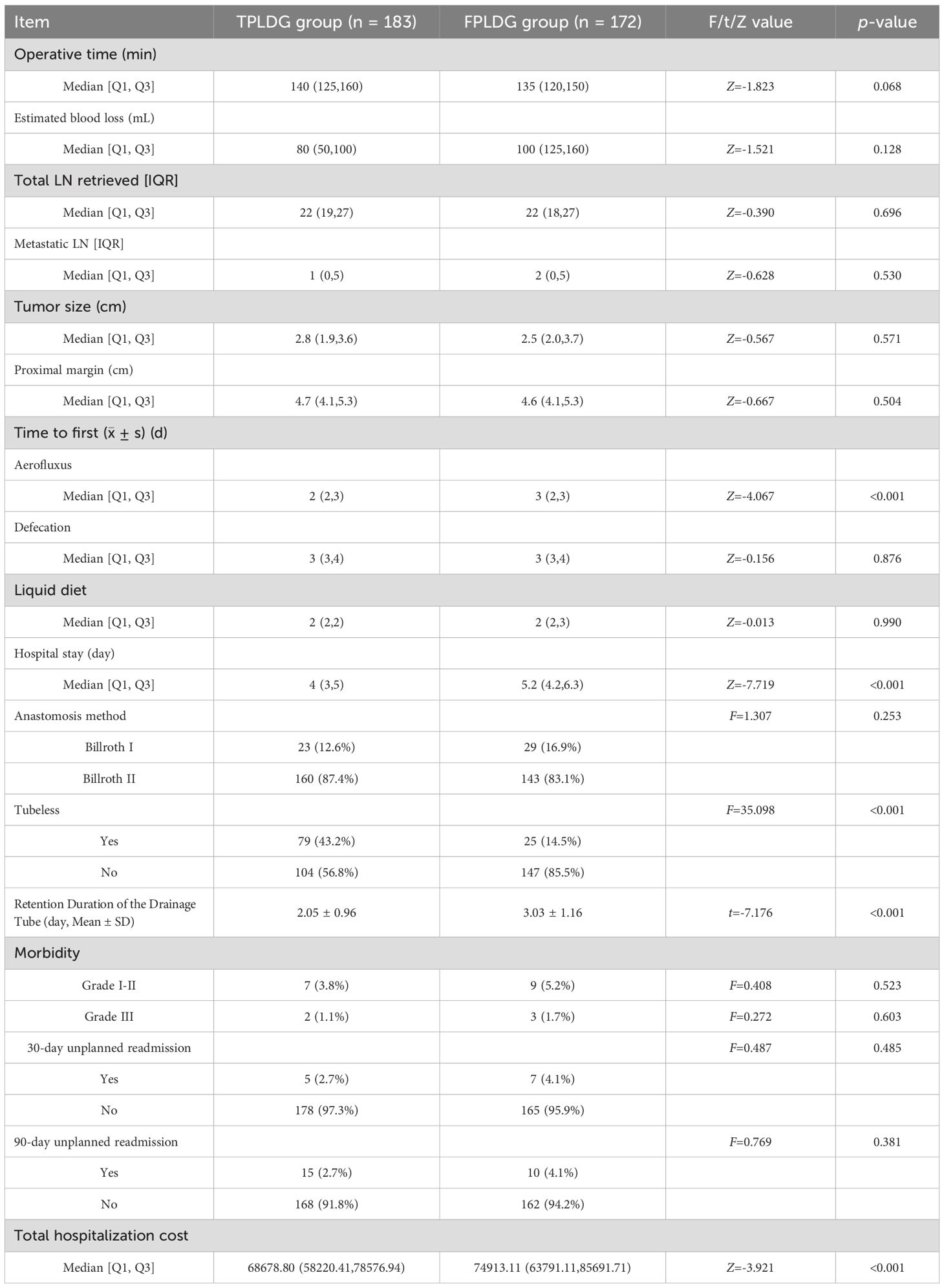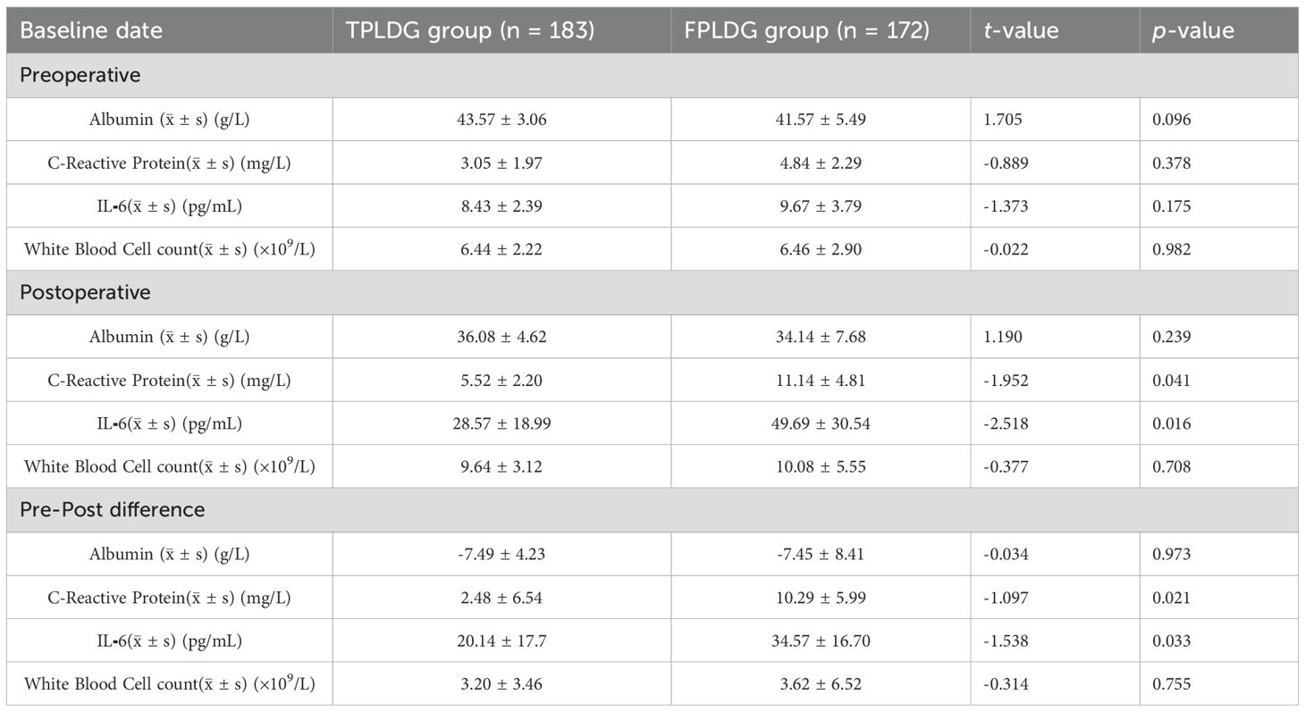 The TPLDG group showed earlier time to first flatus[2(2,3) vs. 3(2,3) day, Z=-4.067, p<0.001], shorter hospital stay [4(3,5) vs. 5.2(4.2,6.3) day, Z=-7.719, p<0.001]), higher tubeless rate, and lower total hospitalization costs in terms of postoperative recovery.(Table 2)To further compare the differences in postoperative recovery between the two groups, we analyzed inflammatory markers on postoperative day 3. The results demonstrated that the TPLDG group had significantly lower levels of C-reactive protein (CRP) and interleukin-6 (IL-6) compared to the FPLDG group (Table 3).