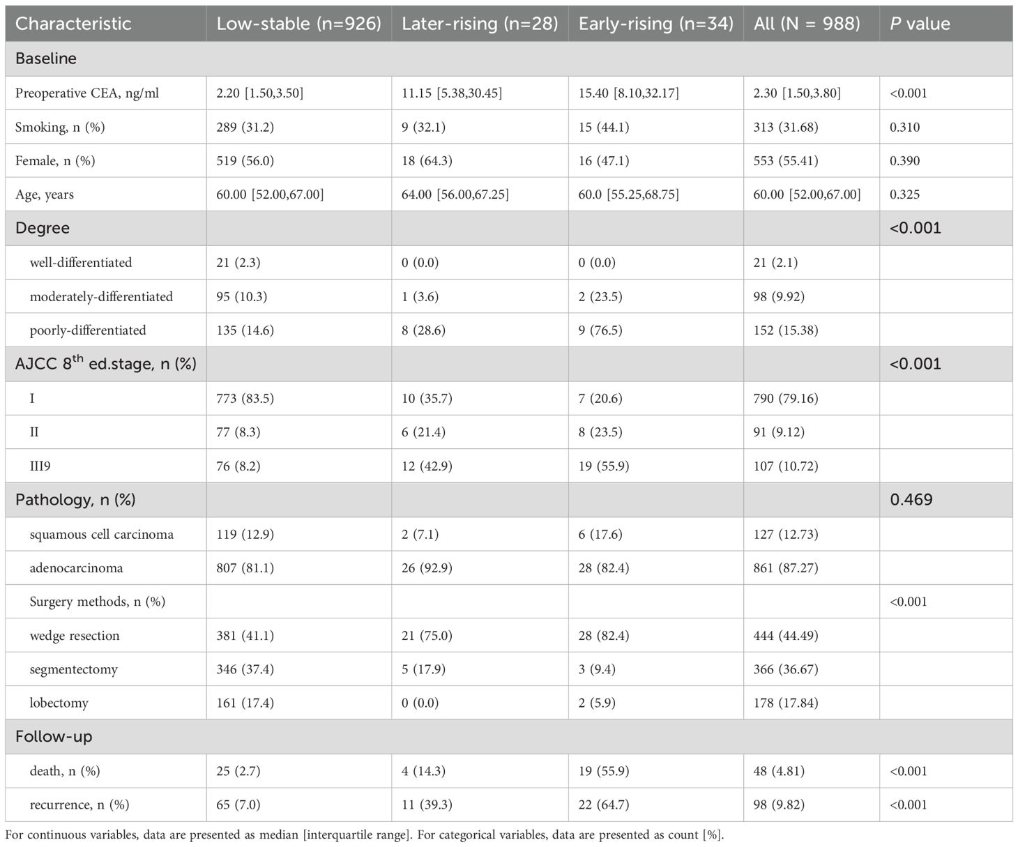 As research indicates that CEA levels in NSCLC patients typically return to normal within six weeks after surgery (22), our trajectory analysis revealed delayed CEA normalization (≤6 months) in the late-rising group and CEA levels reaching nadir at approximately 5 months in the early-rising group. This delay may reflect the current follow-up protocol, where most stage I-IIIA patients undergo CEA testing at 3–6 month intervals post-surgery. These results suggest that more frequent CEA monitoring could enable earlier detection of high-risk trajectories, particularly in patients with intraoperative findings suggestive of micrometastases such as visceral pleural invasion or lymphovascular invasion.