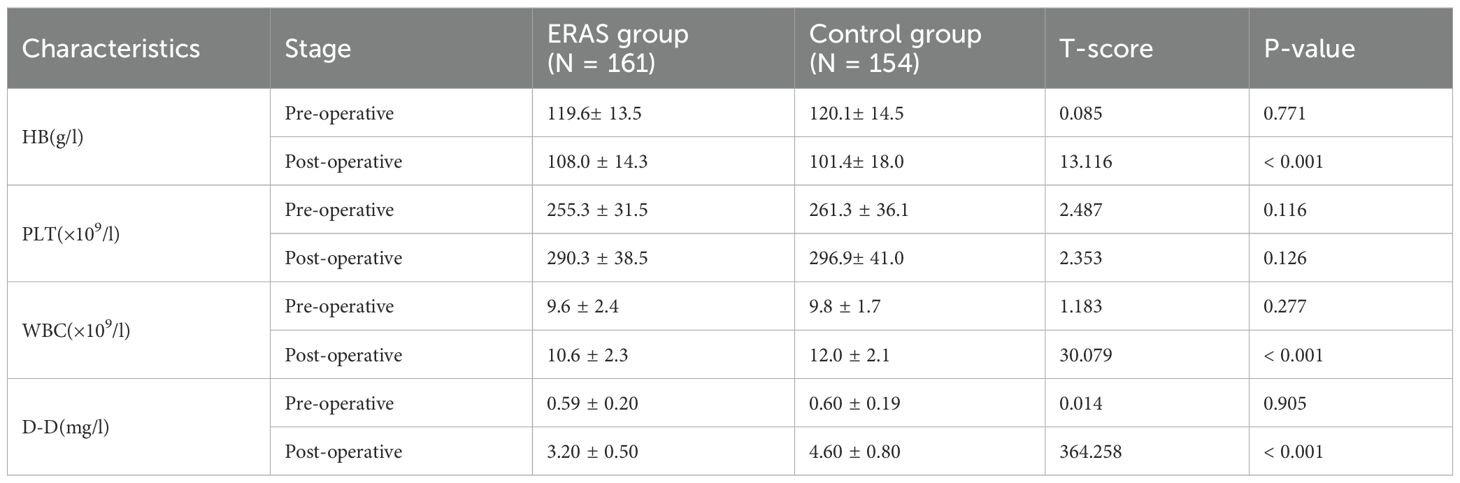 Our study adopted a quantitative classification methodology to assess the risk of venous thromboembolism in patients with gynecological cancer during the perioperative period. It delved into the impact of ERAS on venous thrombosis from multiple aspects, including laboratory indicators, risk assessment levels, and the incidence of thrombotic events. The results indicated no conspicuous differences in preoperative general information and risk indicators between the two groups. However, significant alterations were observed postoperatively. During the perioperative phase, due to blood and fluid losses plus surgical stress and inflammatory mechanisms, an inevitable decline in hemoglobin values occurred, accompanied by elevated white blood cell count, platelet count, and higher D-dimer levels, all signaling a hypercoagulable state and augmented thrombosis risk (13). In the ERAS group, the trends of changes in hemoglobin, white blood cell count, D-dimer values, KS risk grading, and the proportion of high-risk patients were more favorable. This suggests these patients had a lower probability of experiencing anemia, inflammatory stress, and hypercoagulability, potentially leading to reduced VTE risk. Notably, the VTE incidence was significantly lower in the ERAS group, highlighting the efficacy of comprehensive thromboprophylaxis within ERAS.
