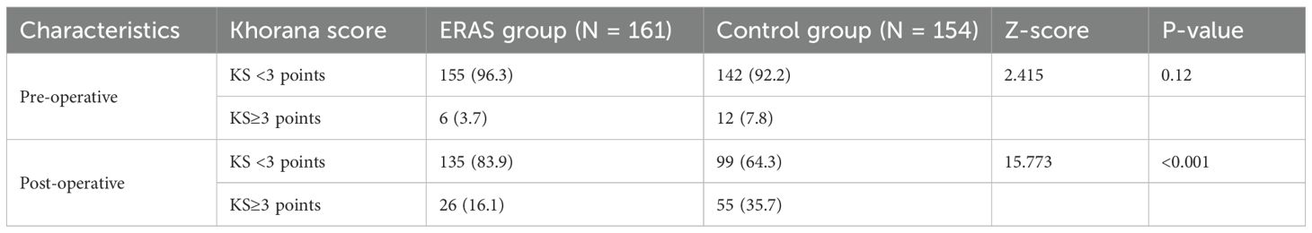 Table 3. Comparison of Khorana score for perioperative tumor thrombosis risk between the control group and ERAS group.