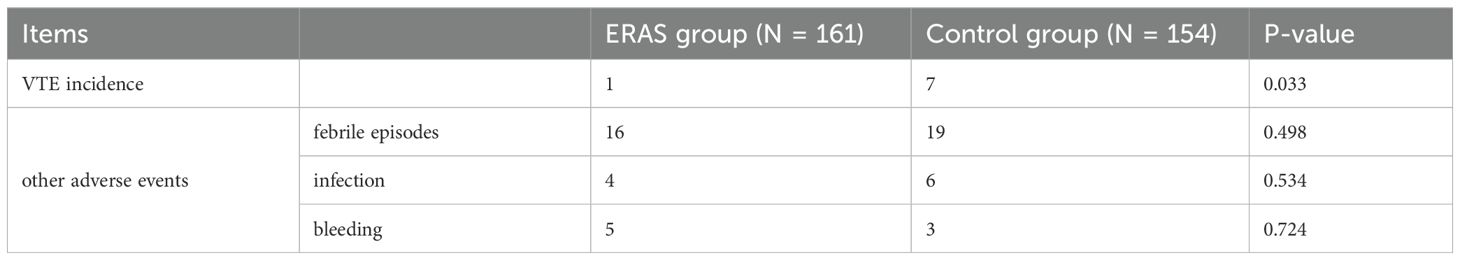 Table 4. Comparison of VTE incidence and other adverse events for between the control group and ERAS group.
