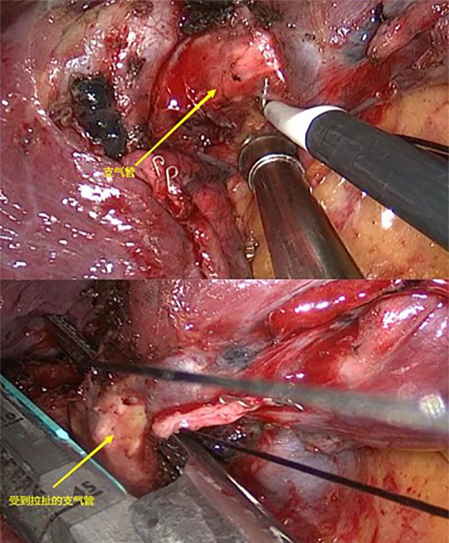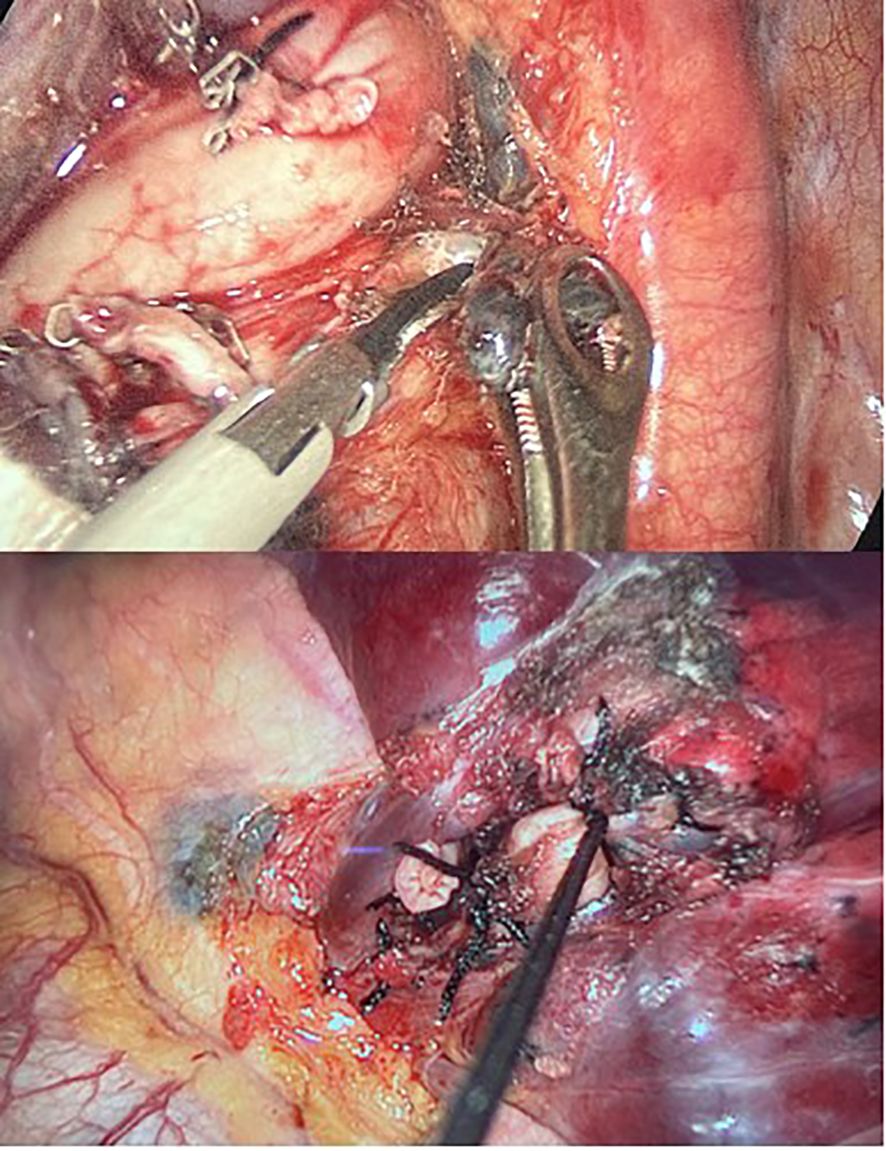 Electric coagulation hook dissection + stapler transection: Under the premise of ensuring safety, the use of electrocautery hooks should be prioritized for segmental hilar dissection and lymph node sampling, minimizing the use of ultrasonic scalpels. The bronchus of the lung segment was transected using an endoscopic stapler as close to the root as possible. The segmental vessels were also transected using the stapler (Figure 2).