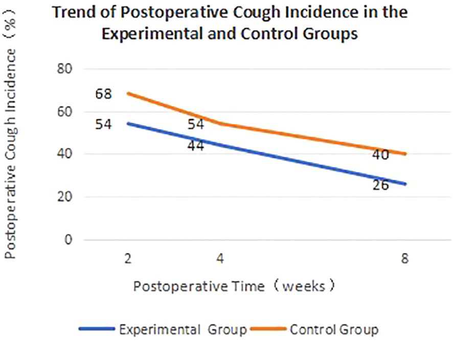 The modified measures significantly improved the intensity of postoperative cough symptoms and quality of life. Research data show that the experimental group had significantly lower scores on the Mandarin Chinese version of the Leicester Cough Questionnaire (LCQ-MC) at all follow-up time points compared to the control group. This result surpasses the cough scores reported by Xie et al. (22) after implementing standardized surgical procedures (17.31 ± 1.19 at 8 weeks post-surgery and 18.29 ± 0.74 at 10 weeks post-surgery).