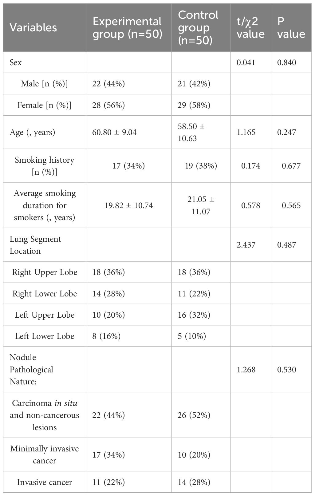 There were no statistically significant differences (P > 0.05) in baseline characteristics between the two groups of patients regarding gender, age, smoking history, average smoking duration for smokers, surgical resection of lung segments, and pathological nature of nodules. See Table 1.