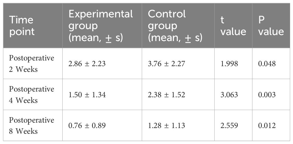 The project team assessed the intensity of cough symptoms using the Visual Analogue Scale (VAS), where lower scores indicate lesser intensity of cough symptoms. Table 2 presents a comparison of the VAS scores for cough symptoms between the two groups of patients at 2 weeks, 4 weeks, and 8 weeks post-surgery.