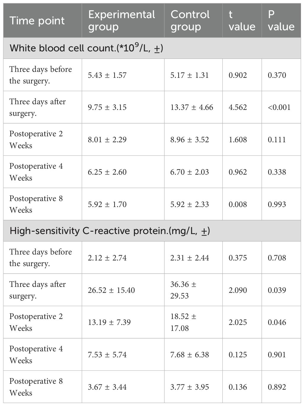 Table 4. Comparison of postoperative inflammatory marker levels between the experimental group and the control group.
