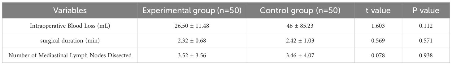 To comprehensively assess the safety and effectiveness of the modified intraoperative bronchial protection measures, this study conducted a detailed comparison and analysis of the intraoperative-related indicators between the experimental and control groups. The main comparative indicators included intraoperative blood loss, surgical duration, and the number of lymph nodes dissected (Table 5).