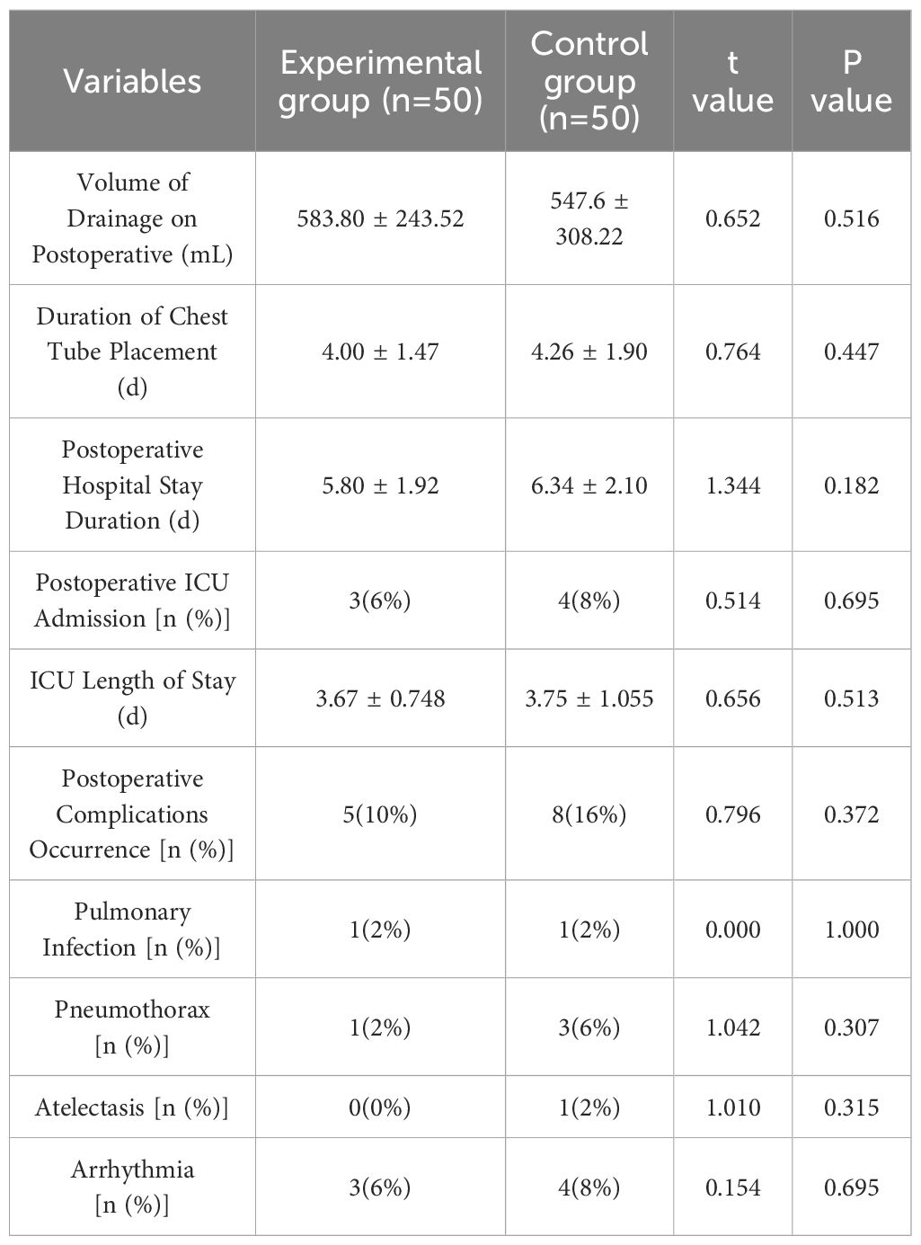 The occurrence of postoperative complications in the two groups is shown in Table 6. Neither group had cases of respiratory failure, bronchopleural fistula, reoperation due to hemothorax, or chylothorax, and there were no perioperative deaths. The overall complication rate in the experimental group was slightly lower than that in the control group, but this difference was not statistically significant (P > 0.05). Postoperative complications in both groups improved after symptomatic treatment, allowing for discharge.