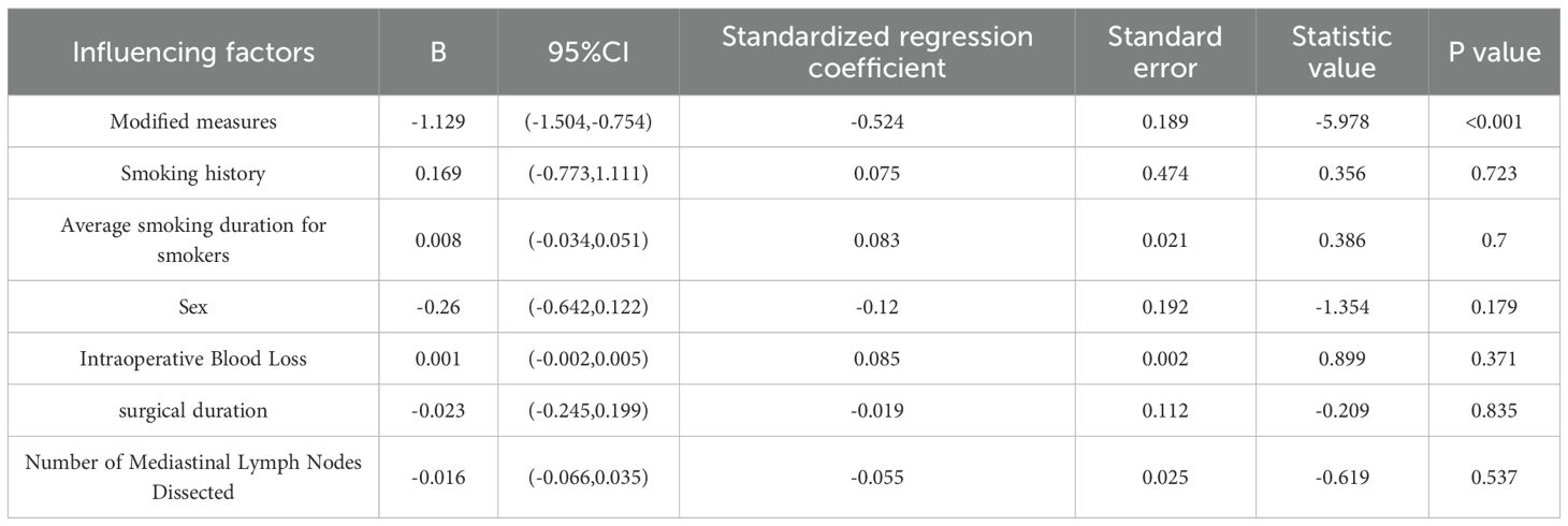 The results indicate that after controlling for potential confounding variables, the modified measures we implemented remain independent protective factors for reducing the risk and severity of postoperative cough (B = -1.129, 95% CI: -1.504 to -0.754, p < 0.001).