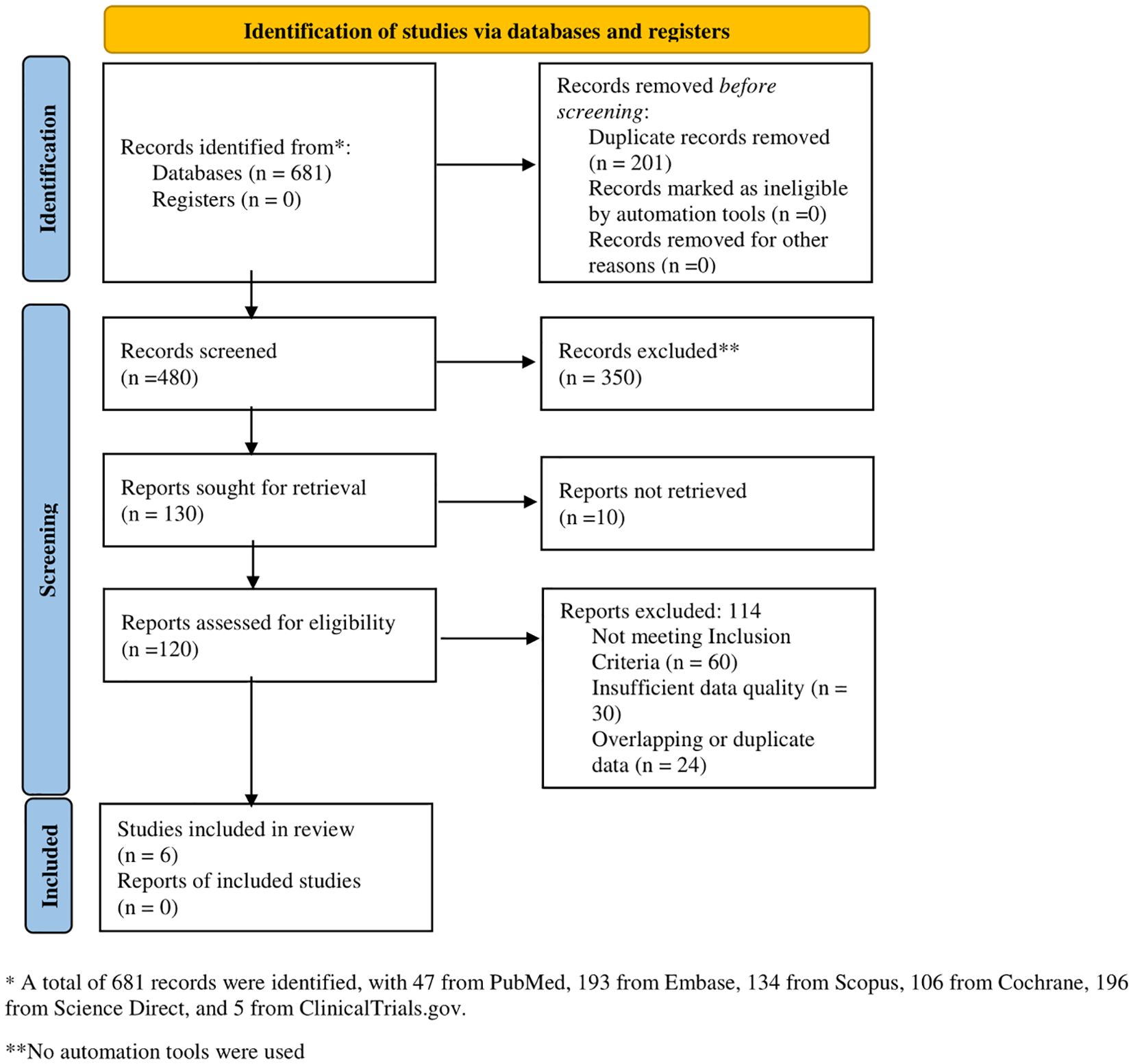 Following PRISMA guidelines, a total of 681 records were identified across multiple databases, including PubMed (n = 47), Embase (n = 193), Scopus (n = 134), Cochrane (n = 106), Science Direct (n = 196), and ClinicalTrials.gov (n = 5). After screening 480 records, 350 were excluded. Of the 130 reports sought for retrieval, 10 were unavailable, leaving 120 for eligibility assessment. Among these, 114 were excluded due to unmet inclusion criteria (n = 60), insufficient data quality (n = 30), or duplication (n = 24). Ultimately, six studies were included in the final review (Figure 1).