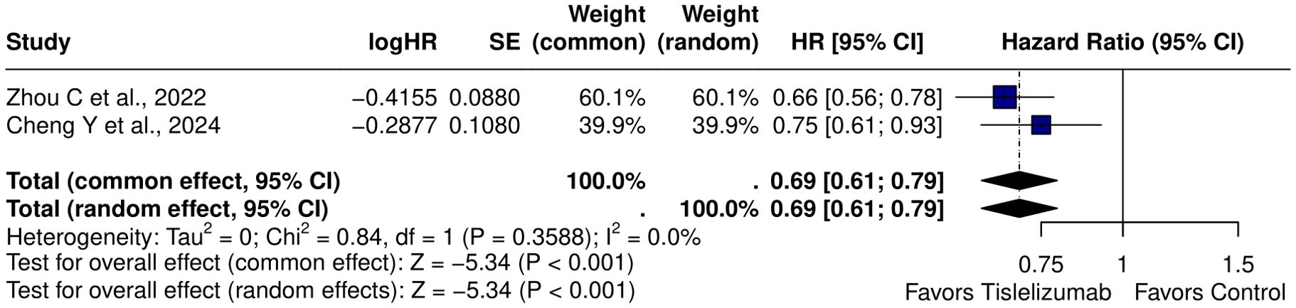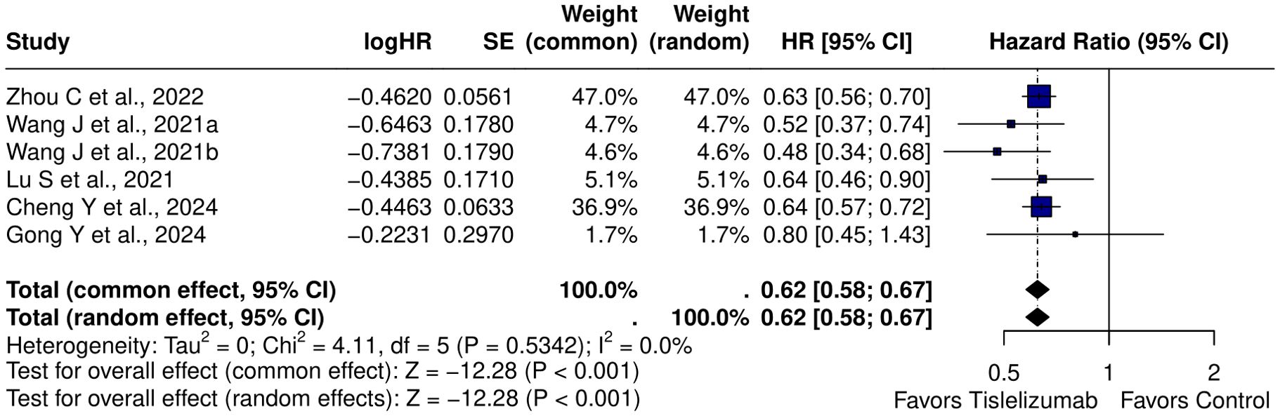The pooled HR for PFS using a random effects model was 0.62 (95% CI: 0.58–0.67, p < 0.001), indicating a significant benefit of Tislelizumab-based treatment. Heterogeneity was minimal (I² = 0.0%, τ² = 0, p = 0.5342). Egger’s regression test for small-study effects showed no significant publication bias (t = -0.66, df = 4, p = 0.543), with a bias estimate of 0.4935 (SE = 0.7424), suggesting no substantial asymmetry in the funnel plot (Figure 2). Subgroup analysis demonstrated that Tislelizumab significantly improved PFS in patients with NSCLC (HR = 0.61; 95% CI, 0.55–0.67; I² = 0.7%) and SCLC (HR = 0.65; 95% CI, 0.57–0.73; I² = 0%) (Supplementary Figure S1). Further stratification of NSCLC revealed a pronounced benefit in squamous NSCLC (HR = 0.50; 95% CI, 0.39–0.64; I² = 0%) (Supplementary Figure S2). Only one study, Lu et al. (18), reported outcomes for non-squamous NSCLC, showing an HR of 0.64 (95% CI, 0.46–0.90). When analyzed by treatment regimen, Tislelizumab in combination with chemotherapy improved PFS (HR = 0.62; 95% CI, 0.56–0.69; I² = 1%). Excluding Zhou et al. (10), which evaluated Tislelizumab monotherapy, yielded a pooled HR of 0.63 (95% CI, 0.56–0.70) for the monotherapy subgroup. Two studies (21, 22) reported PFS duration in months, comparing the intervention and control groups. The pooled PFS using a double-arm model was 1.30 months (95% CI: 0.26–6.42), with no significant heterogeneity (I² = 0.0%, τ² = 0, p = 0.9816; z = 0.32, p = 0.7476).