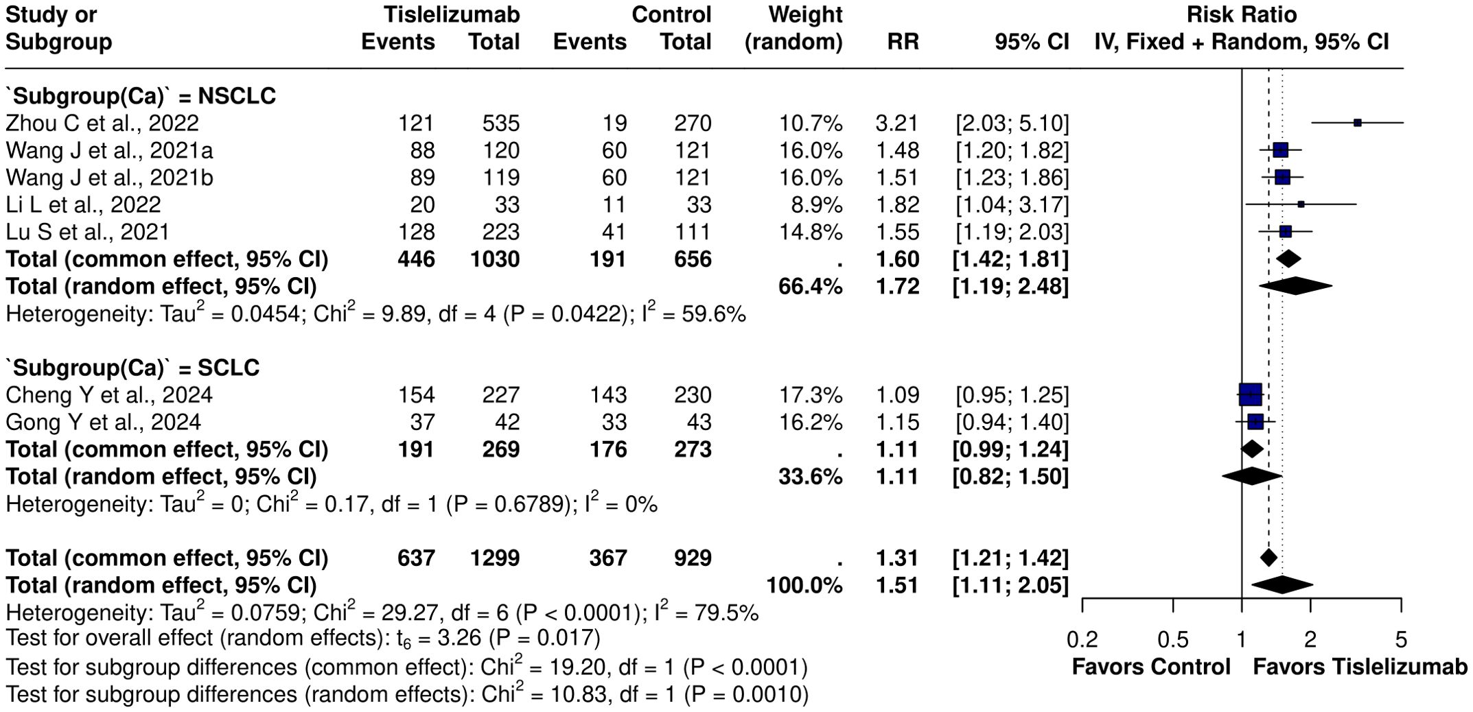 ORR was significantly higher in the Tislelizumab group (RR = 1.51; 95% CI, 1.19–1.90; I² = 79.5%), with heterogeneity remaining unchanged in leave-one-out sensitivity analysis. In a pooled analysis of six studies evaluating Tislelizumab combination therapy, the RR was 1.34 (95% CI, 1.11–1.63), although Zhou et al. (10) reported a substantially higher effect for Tislelizumab monotherapy (RR = 3.21; 95% CI, 2.03–5.10) (Supplementary Figure S3). The effect was attenuated in SCLC (RR = 1.11; 95% CI, 0.82–1.50; I² = 0%) but remained significant in NSCLC (RR = 1.72; 95% CI, 1.19–2.48; I² = 59.6%) (Figure 4) (Supplementary Figure S4). Further stratification of NSCLC showed benefit in squamous NSCLC (RR = 1.49; 95% CI, 1.32–1.69; I² = 0%) but no effect in non-squamous NSCLC (RR = 1.60; 95% CI, 0.73–3.50; I² = 0%). DCR was higher with Tislelizumab (RR = 1.49; 95% CI, 1.18–1.90) compared with chemotherapy alone. DCR (t = 3.67; df = 4; p = 0.0213) exhibited statistically significant publication bias; however, interpretation is limited by the small number of studies. Application of the trim-and-fill method imputed three studies, yielding an adjusted RR of 1.06 (95% CI, 0.60–1.88; p = 0.85; I² = 96%), which attenuated the effect.
