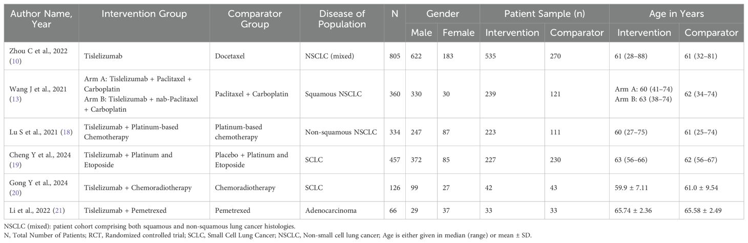 A total of six studies were included in this systematic review and meta-analysis, encompassing 2,148 patients, of whom 1,299 (60.5%) were in the treatment group. We compared treatment regimens involving Tislelizumab with or without chemotherapy to chemotherapy alone. Table 1 summarizes the study and patient characteristics for a detailed understanding of the included trials.