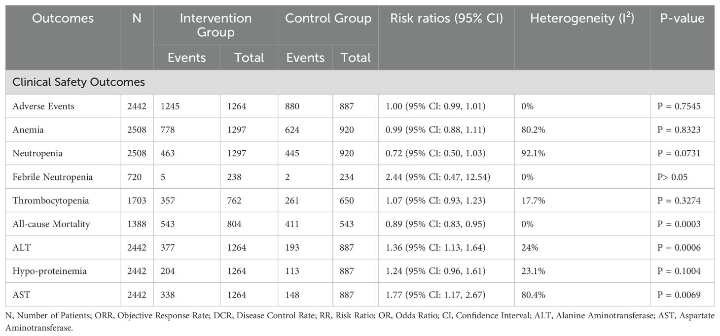 Results: A total of six studies involving 2,148 patients were included in the meta-analysis. Tislelizumab-based regimens showed significant improvements in PFS (HR = 0.62, p < 0.0001) and OS (HR = 0.69, p < 0.0001) compared to chemotherapy alone. The ORR (RR = 1.49, p= 0.0001) and DCR (RR = 1.49, p= 0.0010) were significantly higher in the Tislelizumab group. The Tislelizumab group significantly reduced all-cause mortality (RR = 0.89, p = 0.0003). No significant differences were found in AEs (RR = 1.00, p= 0.75), except for ALT and AST elevations (RR = 1.36; 95% CI, 1.13–1.64) and (RR = 1.77; 95% CI, 1.17–2.67), respectively.