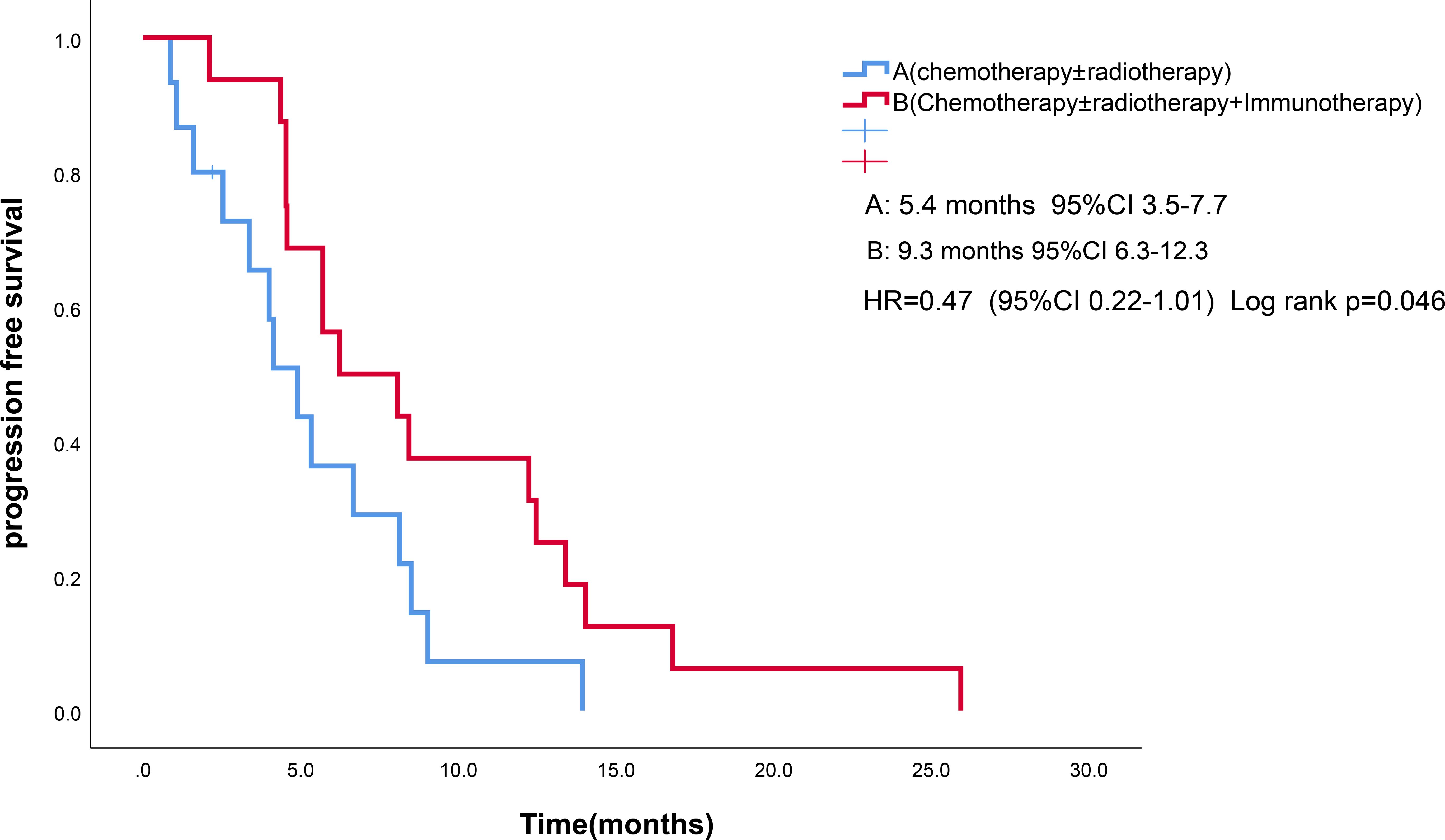 Results: Median progression-free survival (PFS) was significantly longer in the immunotherapy group (9.3 months; 95% CI 6.3-12.3) compared to the non-immunotherapy group (5.4 months; 95% CI 3.5-7.3; P = 0.046). Patients receiving chemotherapy alone demonstrated the shortest PFS (3.2 months; 95% CI 2.1-4.3), while those receiving combined chemotherapy and immunotherapy achieved the longest PFS (10.0 months; 95% CI 3.8-16.1). Median overall survival (OS) of patients with combined immunotherapy showed a trend of prolongation (17.0 months 95% CI 12.9-21.13 vs. 11.6 months 95% CI 4.7-18.6), but no statistically significant difference was observed (p = 0.055). Multivariate analyses suggested that the combination of immunotherapy, or its absence, may affect patient prognosis. Numerical improvements were observed in the immunotherapy group for both objective response rate (ORR: 31.3% vs. 21.4%) and disease control rate (DCR: 93.7% vs. 85.7%).