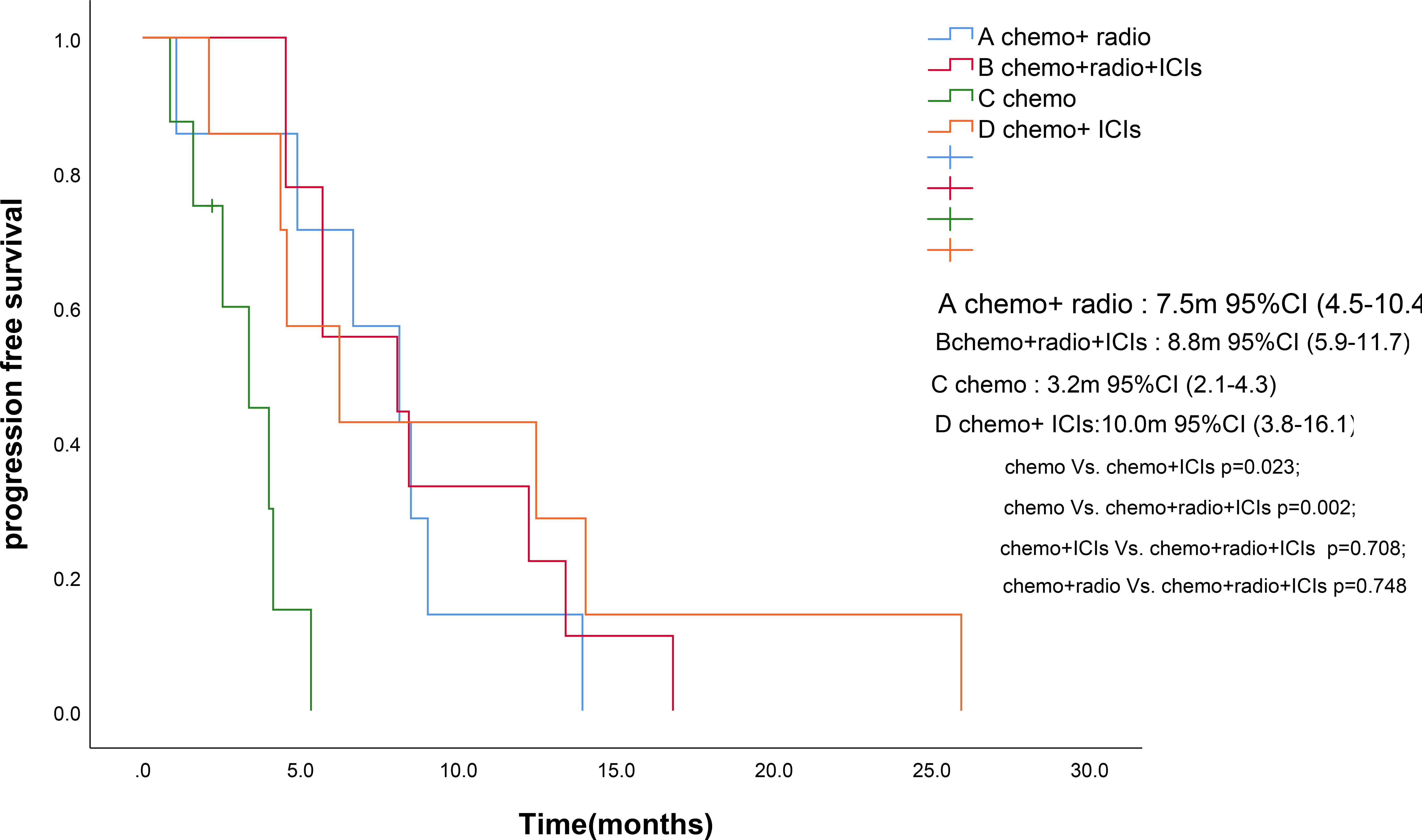 Figure 2. Kaplan-Meier survival estimates in PFS. (A), chemotherapy and radiotherapy ; (B), chemotherapy and radiotherapy and ICIs; (C), chemotherapy; (D), chemotherapy and ICIs. ICIs, Immune checkpoint inhibitors; PFS, Progression Free Survival. .