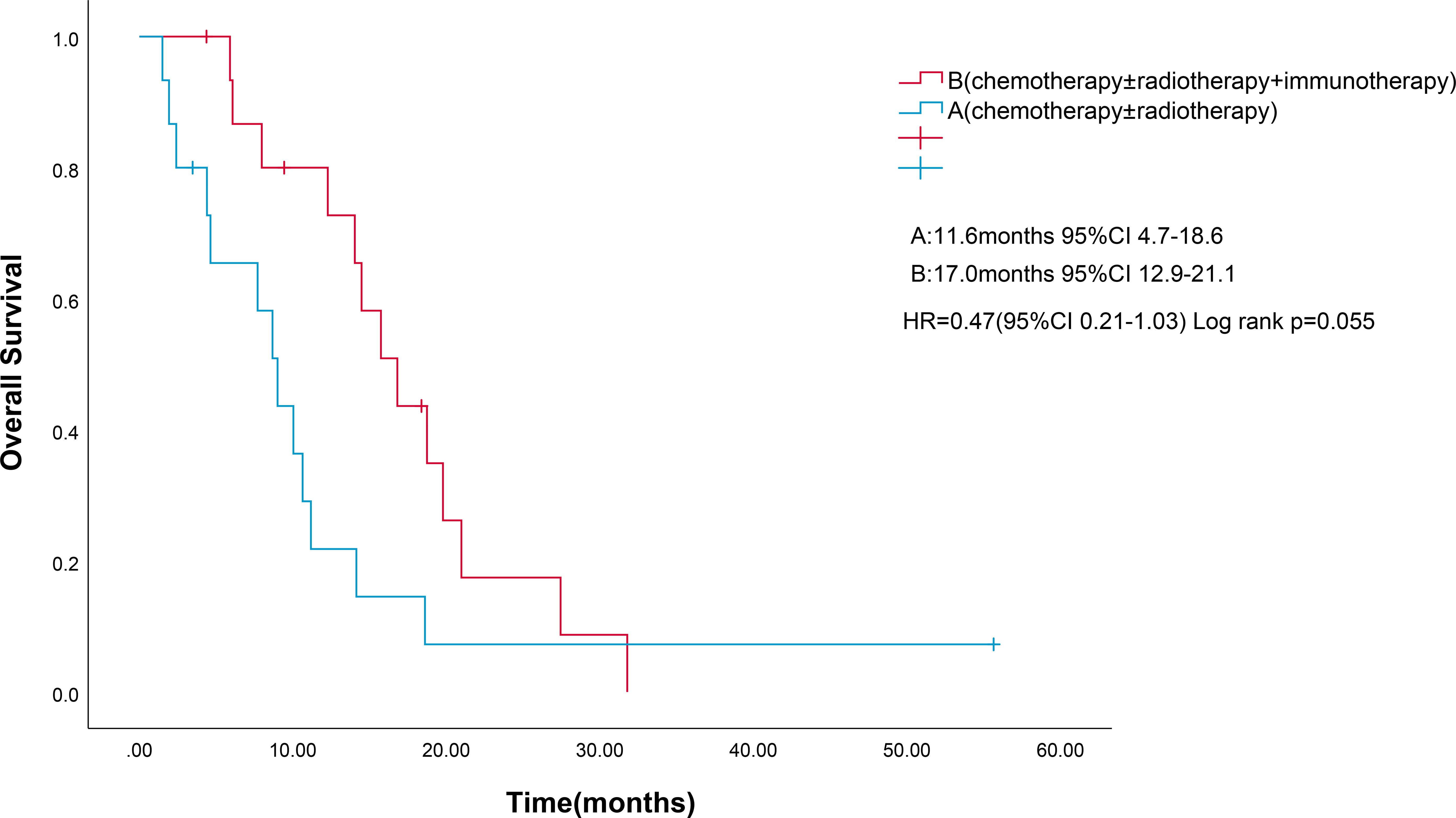 Four patients were lost to follow-up for OS. OS events were documented in 27 patients. Median OS for combined immunotherapy and noncombined immunotherapy were 17.0 months(95% CI 12.9-21.13) and 11.6 months (95% CI 4.7-18.6), respectively (p=0.055) (Figure 3). Multifactorial analyses were performed to identify clinical features that might affect OS of patients (Table 3).