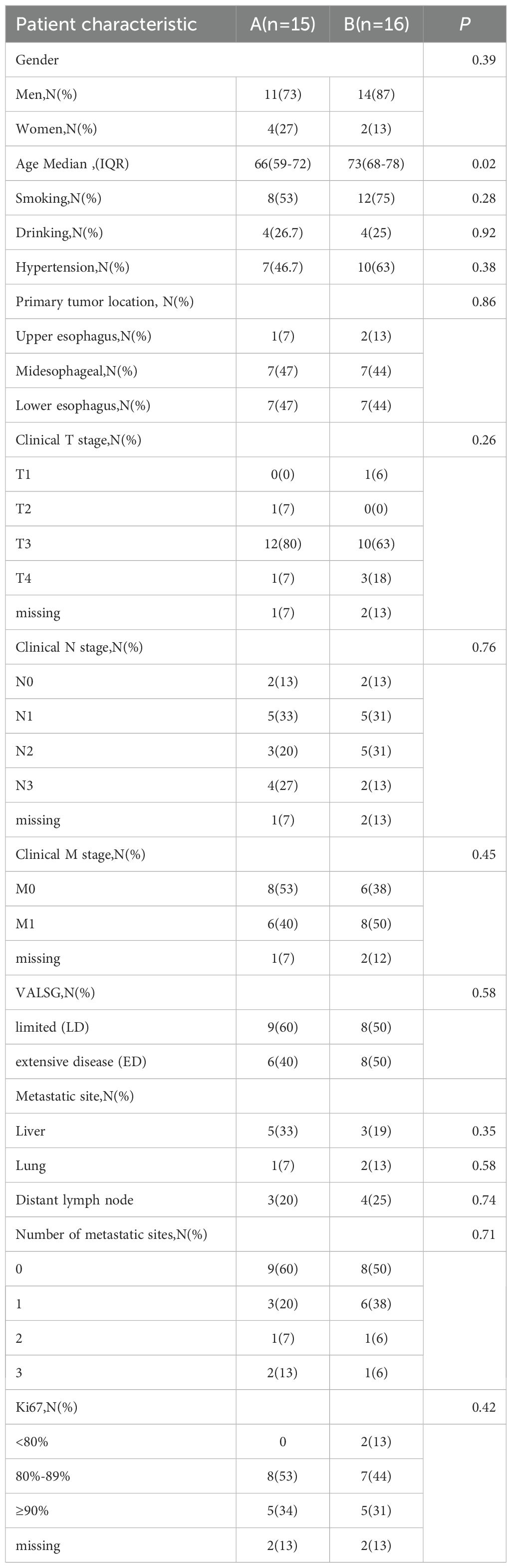 Patients were divided into two treatment arms: Arm A (n=15) received chemotherapy and/or radiotherapy, while Arm B (n=16) received chemotherapy and/or radiotherapy plus immune checkpoint inhibitors. Demographic and clinical characteristics were generally comparable between the two arms, except for age (Table 1).