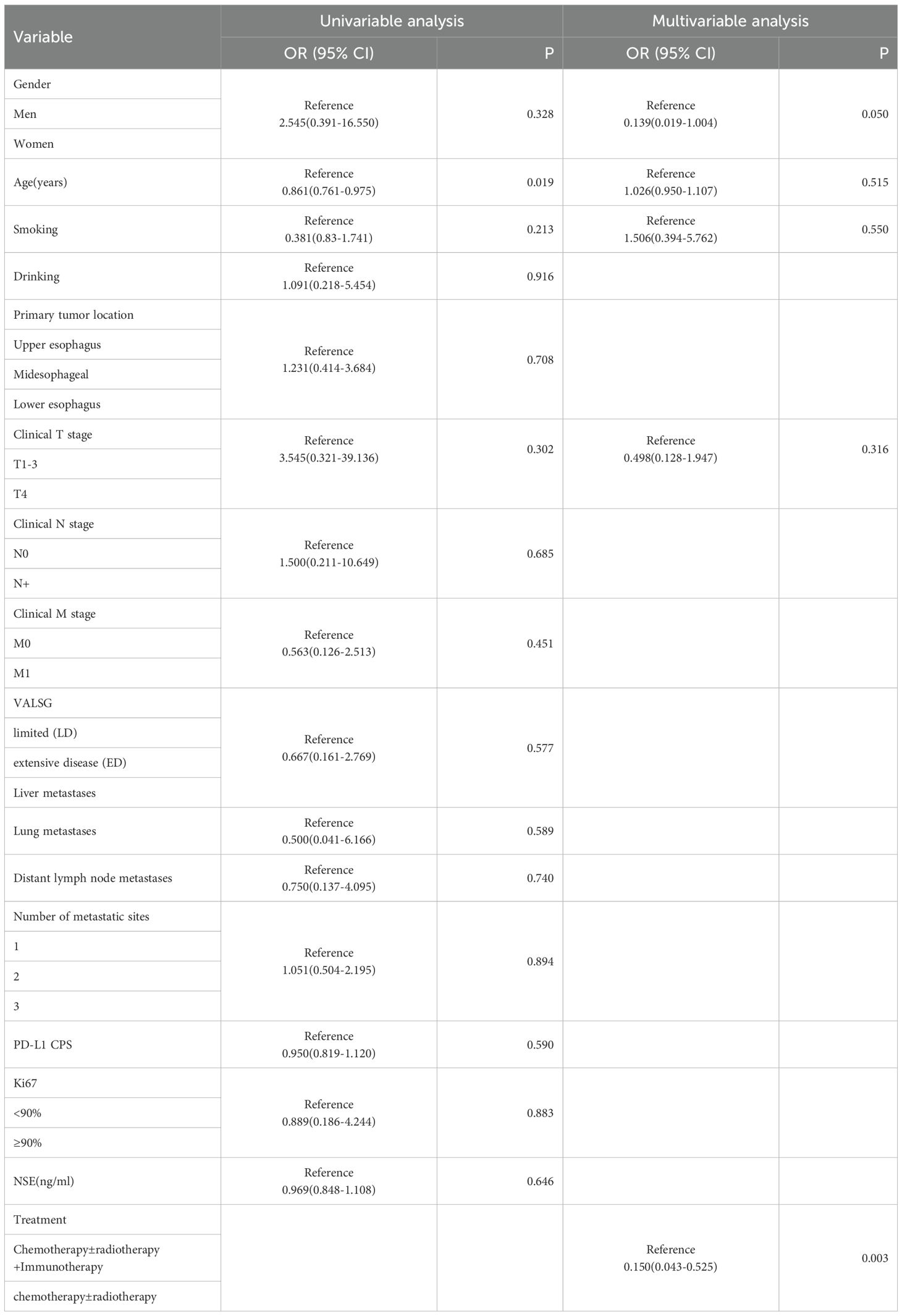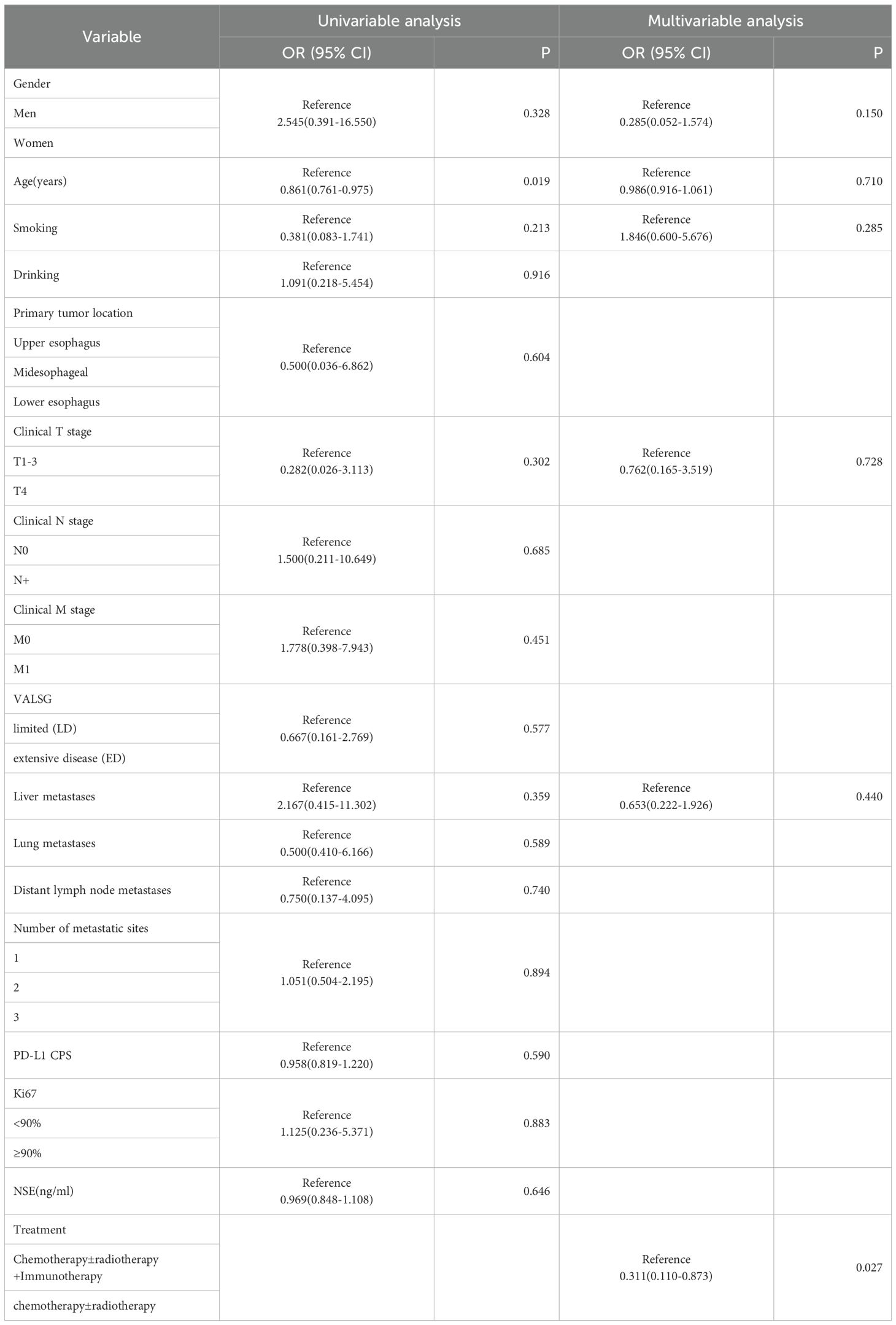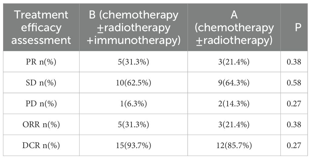 However, due to the limited sample size of this study, PD-L1, TMB, and MSI data could not be obtained, and the study involved a variety of immune checkpoint inhibitors, which may have caused some deviation in the results. The small sample size (n=31) and the unbalanced group sizes (15 versus 16) in this study may cause some deviation in the results. Larger studies are warranted to confirm the efficacy of ICIs specifically in SCCE, perform subgroup analyses, and identify the patient populations most likely to benefit.